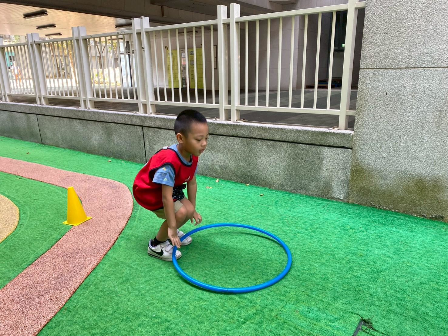 孩子們手握呼拉圈,在老師的引導下,穿梭於排列整齊的三角錐之間。有人快速衝刺,有人小心轉彎,還有人將呼拉圈舉高、跨過、滾動,讓跑步的過程充滿創意與笑聲。這場「呼拉圈接力賽」不僅讓孩子們盡情奔跑、釋放活力,更在變換方向與速度的過程中,培養動作的靈敏度與協調性,提升平衡感與空間判斷力,強化全身肌肉控制與體能發展。