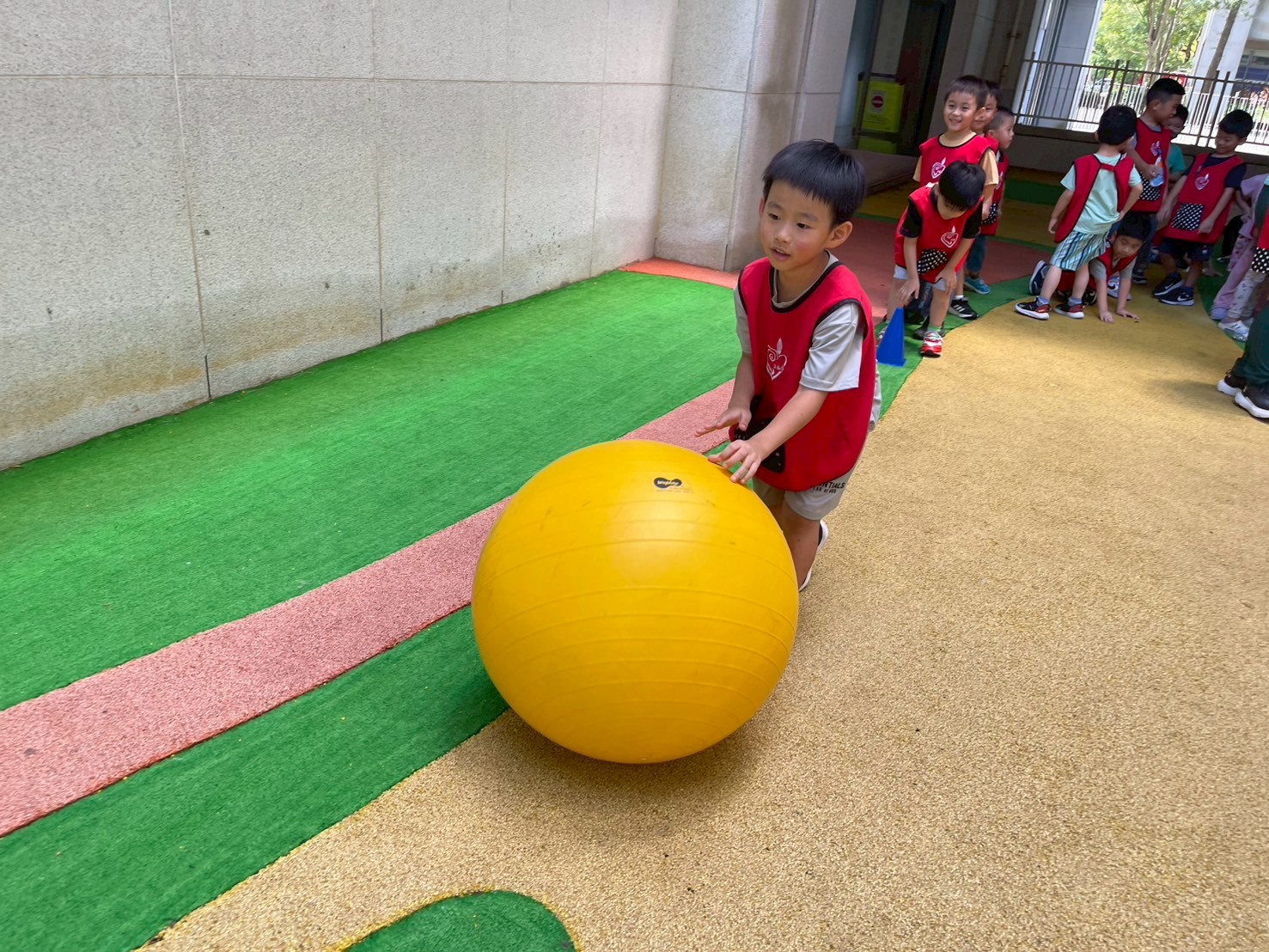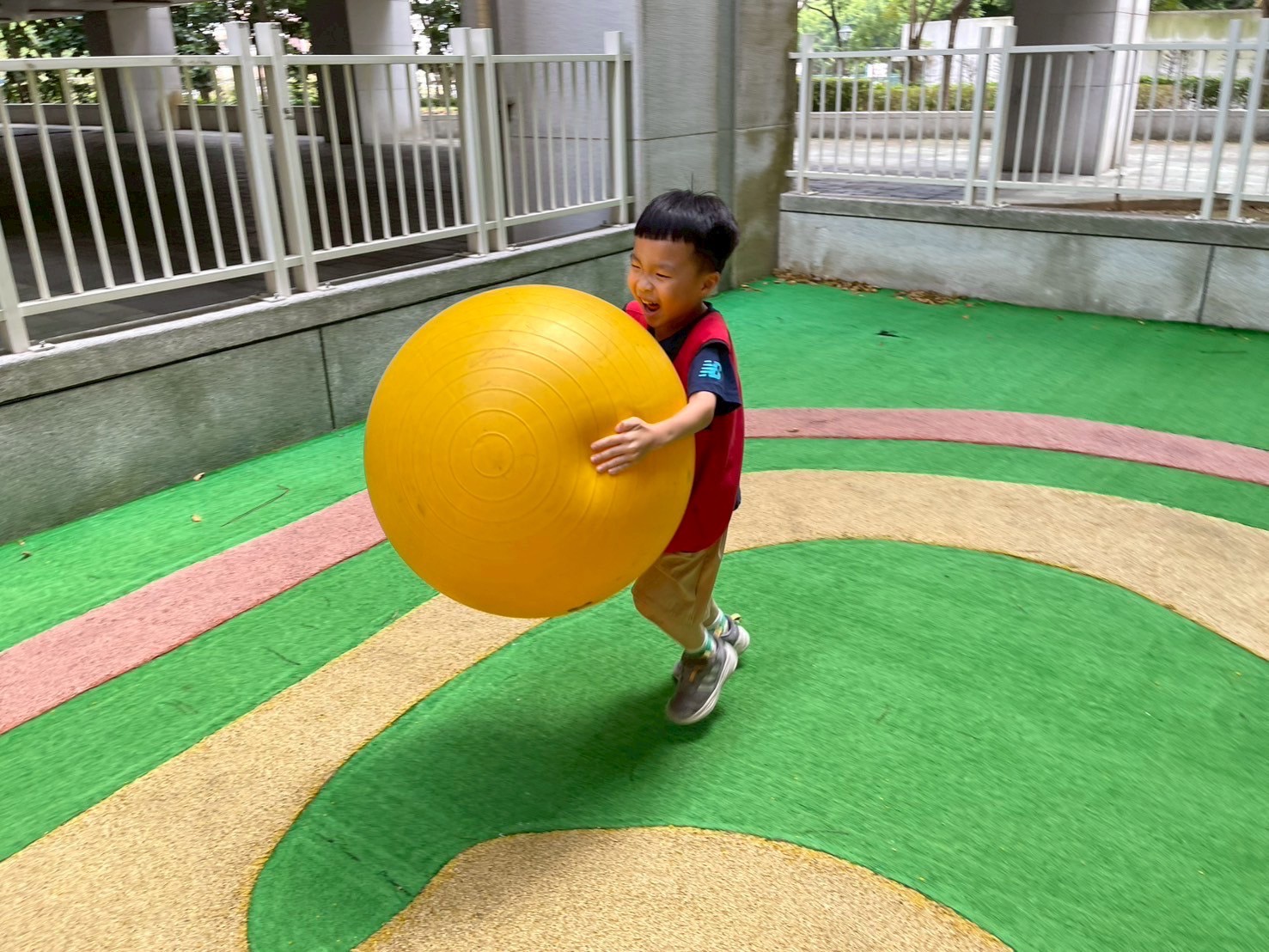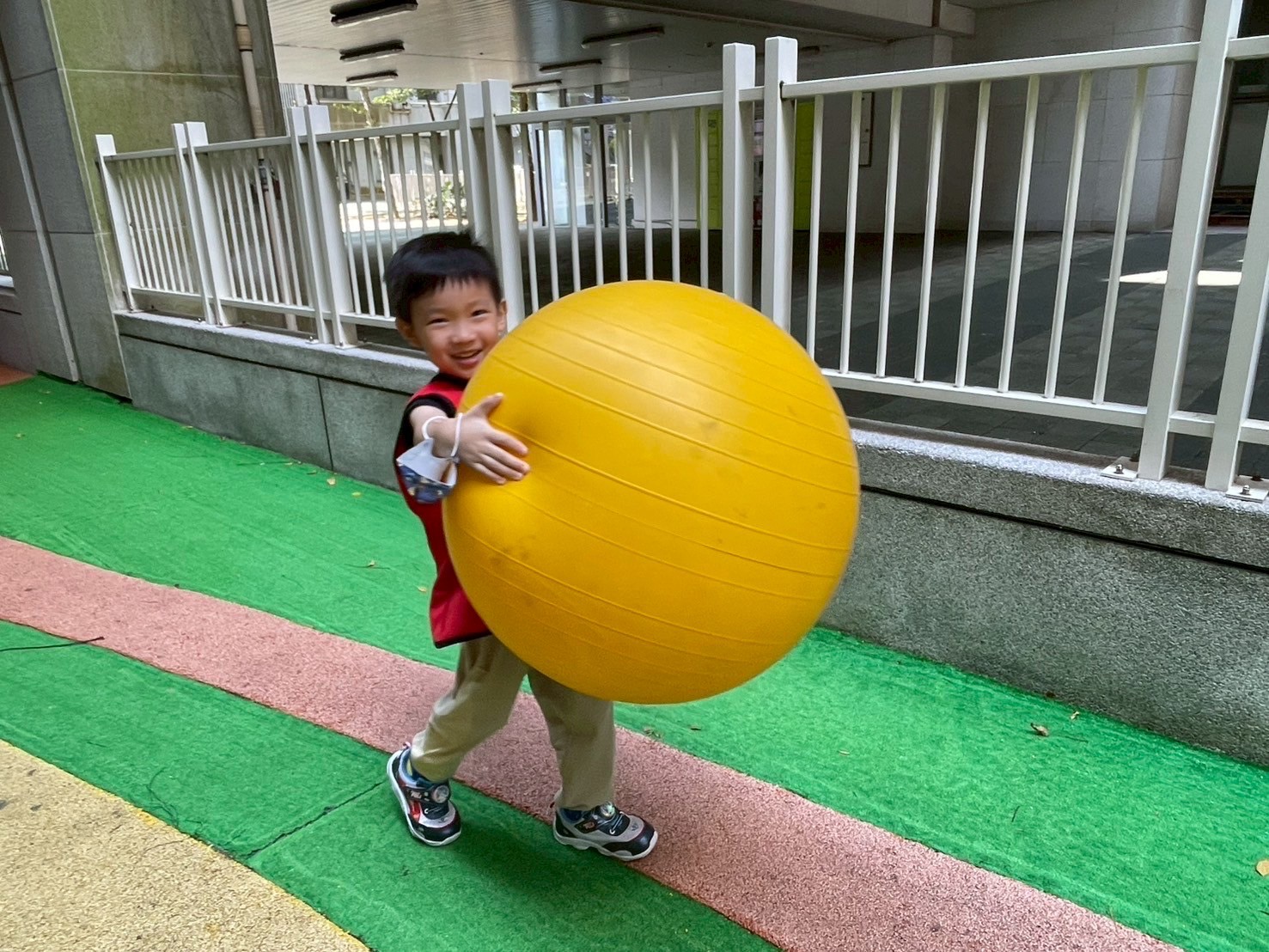 在老師的引導下,孩子們抱著大龍球奔跑,促進身體穩定性及移動性的的發展。透過有趣的體能挑戰,孩子學習覺察身體在穩定與移動間的變化,建立良好的身體協調與自信心。