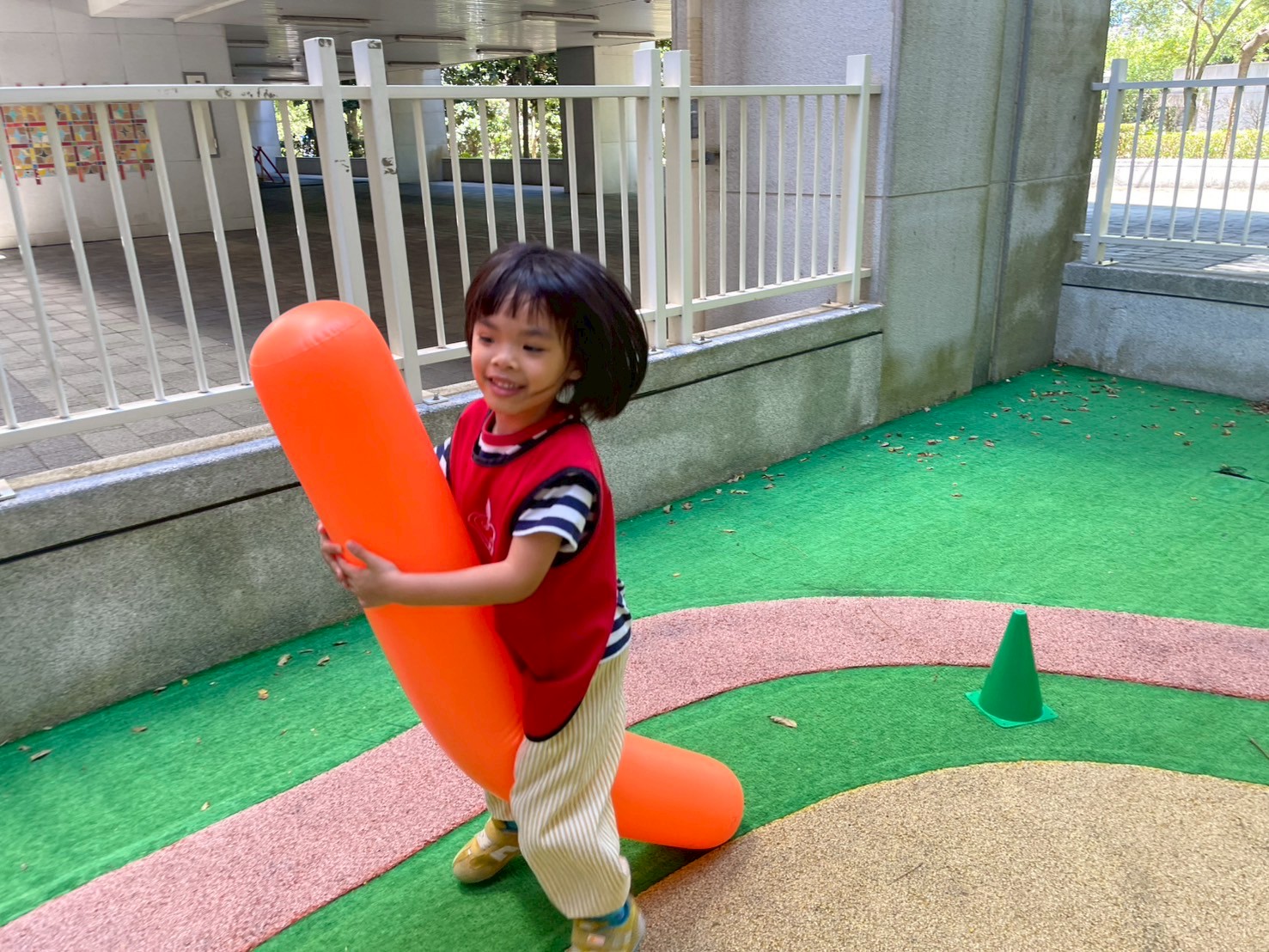 在老師的引導下,孩子們奔跑、追逐著大龍球,或是扛起空氣棒模仿各種動作,遊戲中不只是歡笑,更能促進手眼協調與動態平衡的發展。透過有趣的體能挑戰,孩子學習覺察身體在穩定與移動間的變化,建立良好的身體協調與自信心。