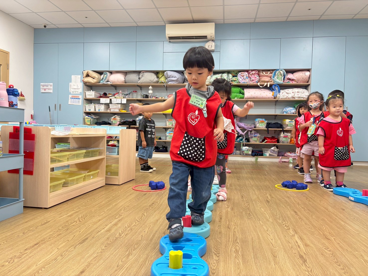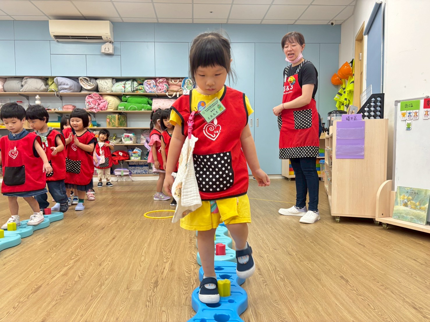 孩子們透過連續跳躍呼拉圈障礙物,與行走萬象組的挑戰,練習下肢肌耐力與身體協調性,活動同時模擬各種動態平衡動作,提升幼兒的專注力與身體控制能力,讓孩子在遊戲中強化動作發展。