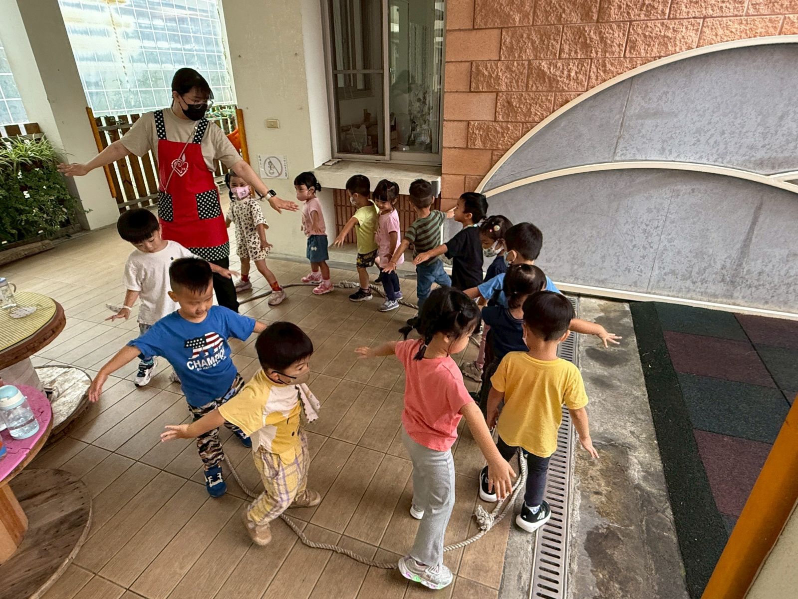 .用麻繩排出不同形狀的軌道,孩子們扮演飛機,沿著麻繩軌道一一排隊行進並從中學習在隊伍中保持適當的距離。