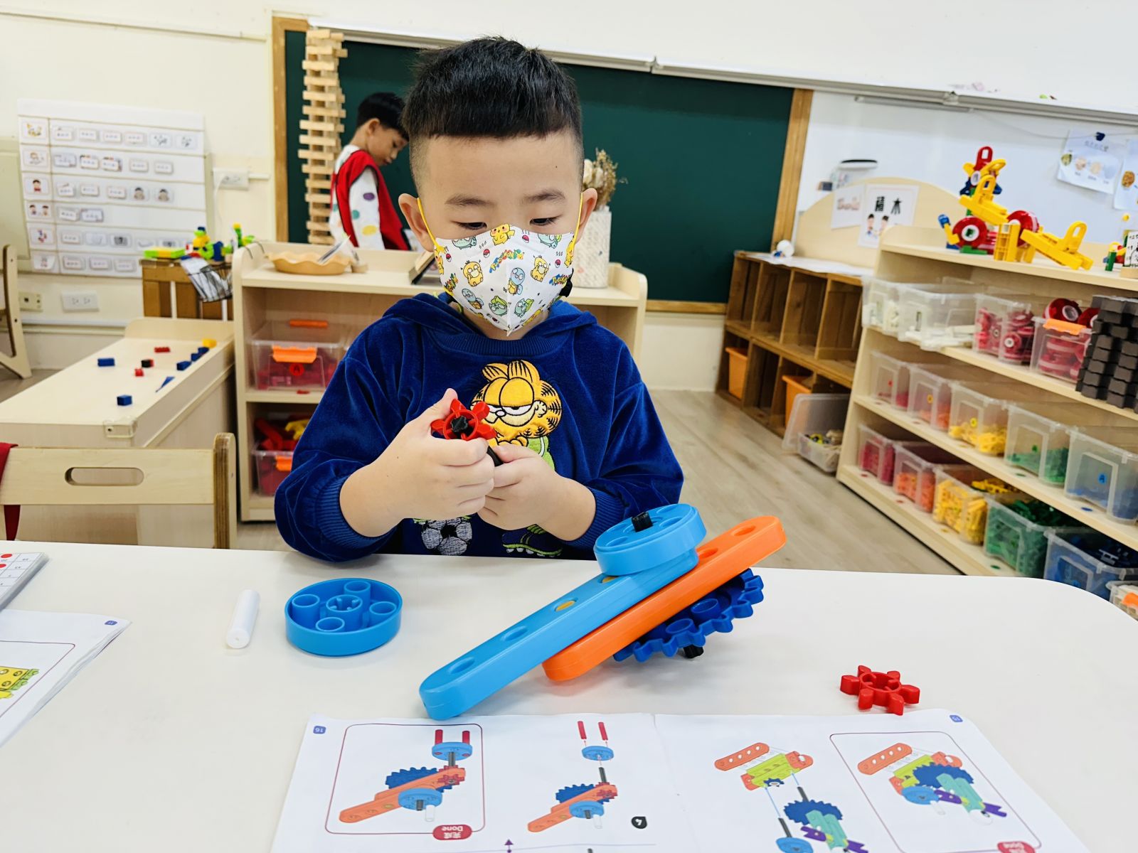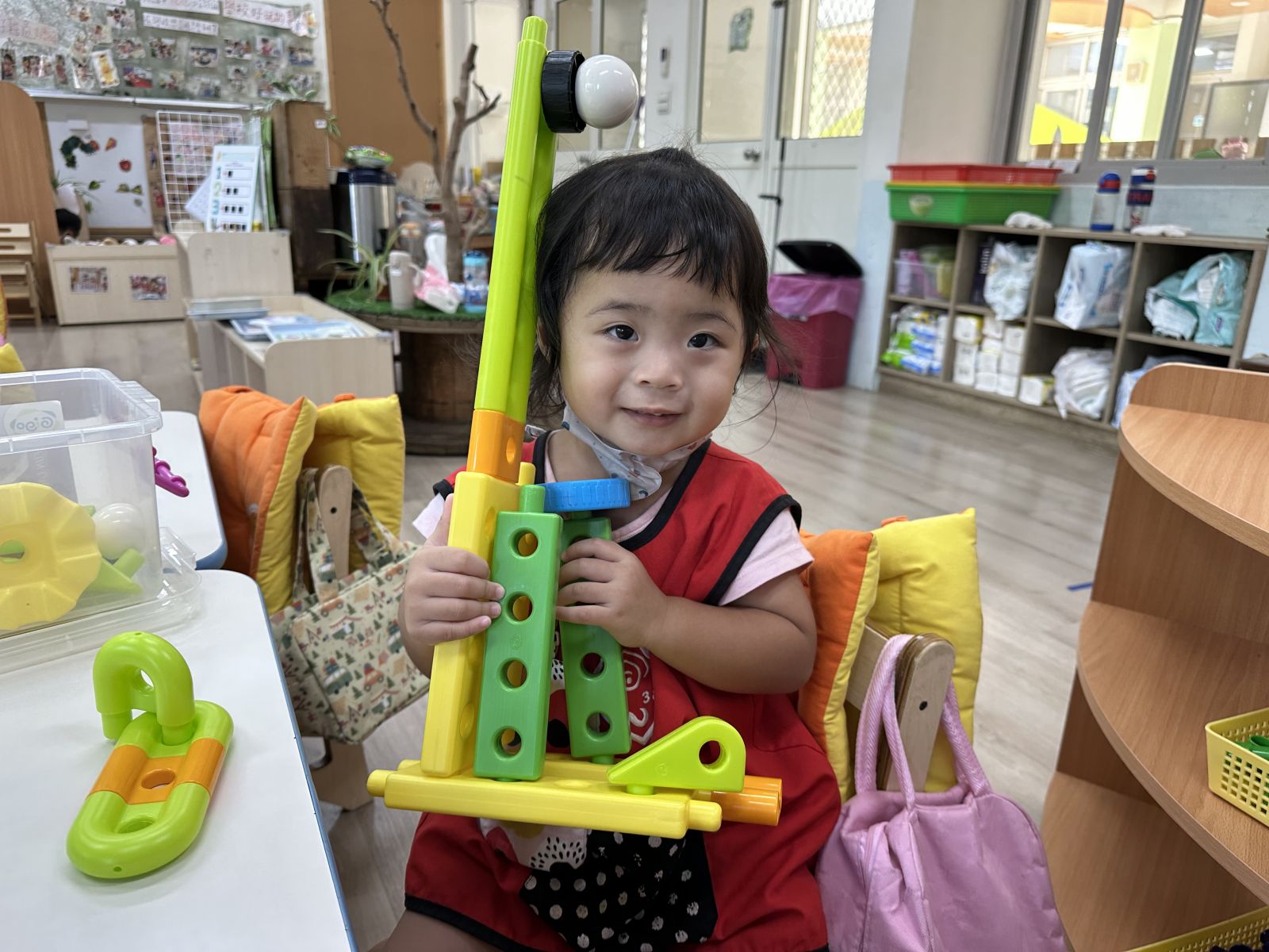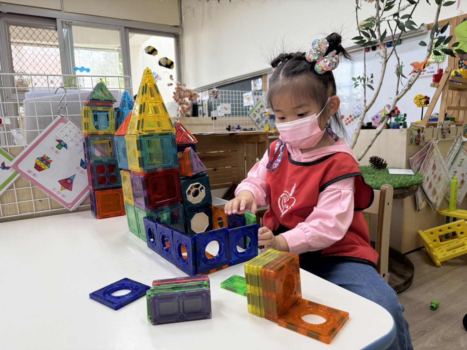 .孩子能仔細比對圖卡,耐心調整積木方向,專注完成作品。