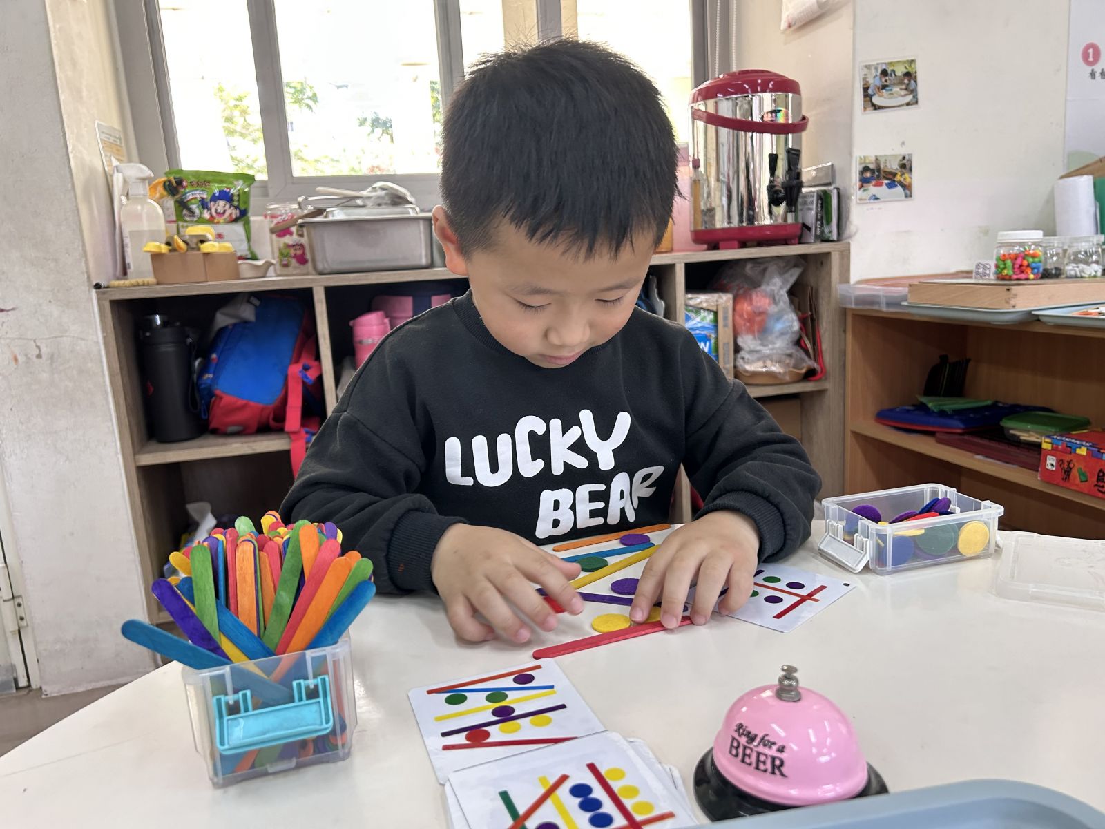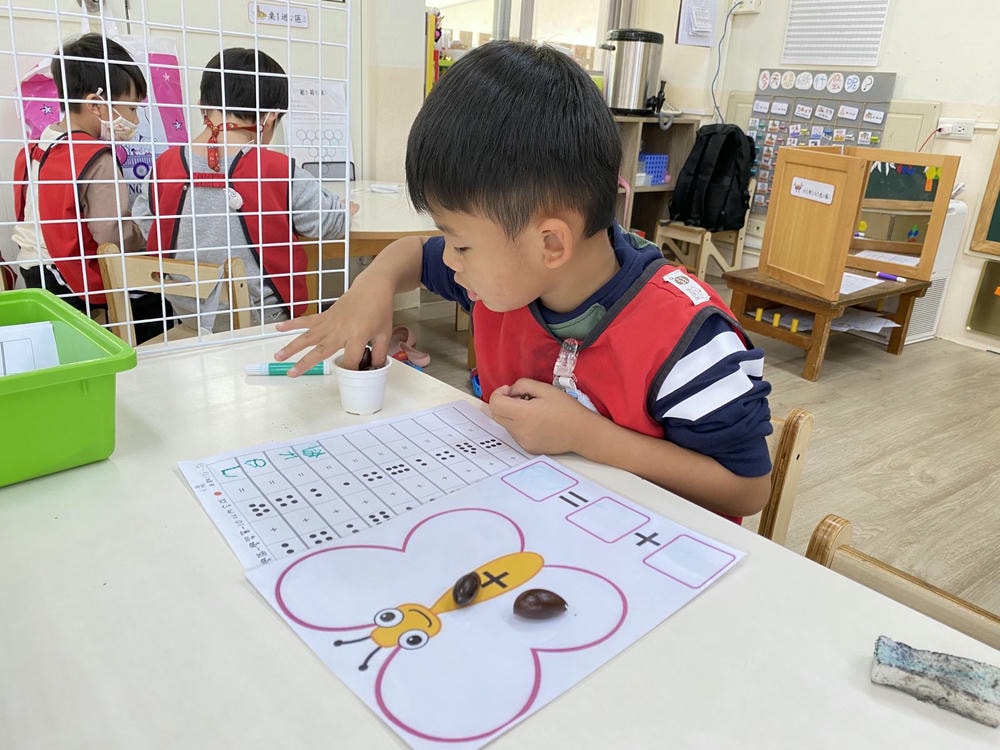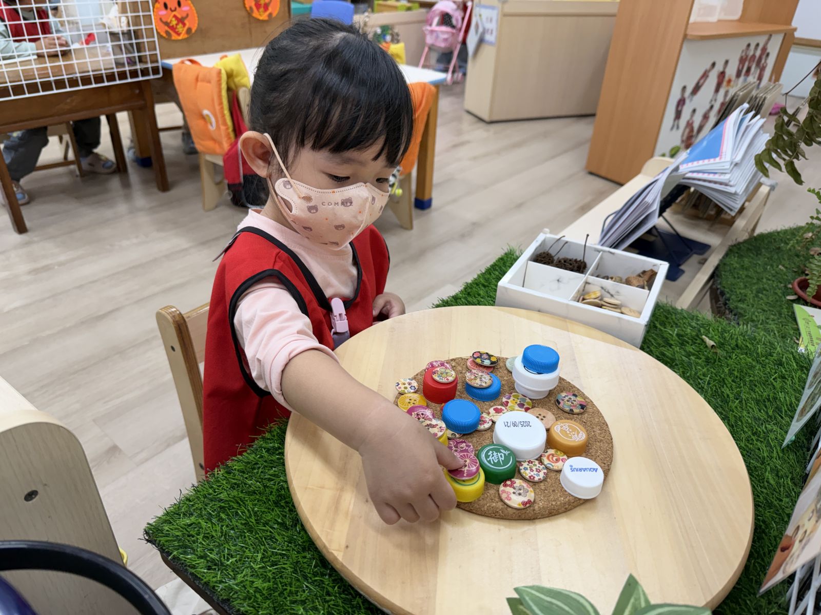 .孩子觀察圖片中的線索,並拿取正確的素材擺放在鐵盤上完成與圖片相同的作品,在過程中認識基本的顏色與形狀。