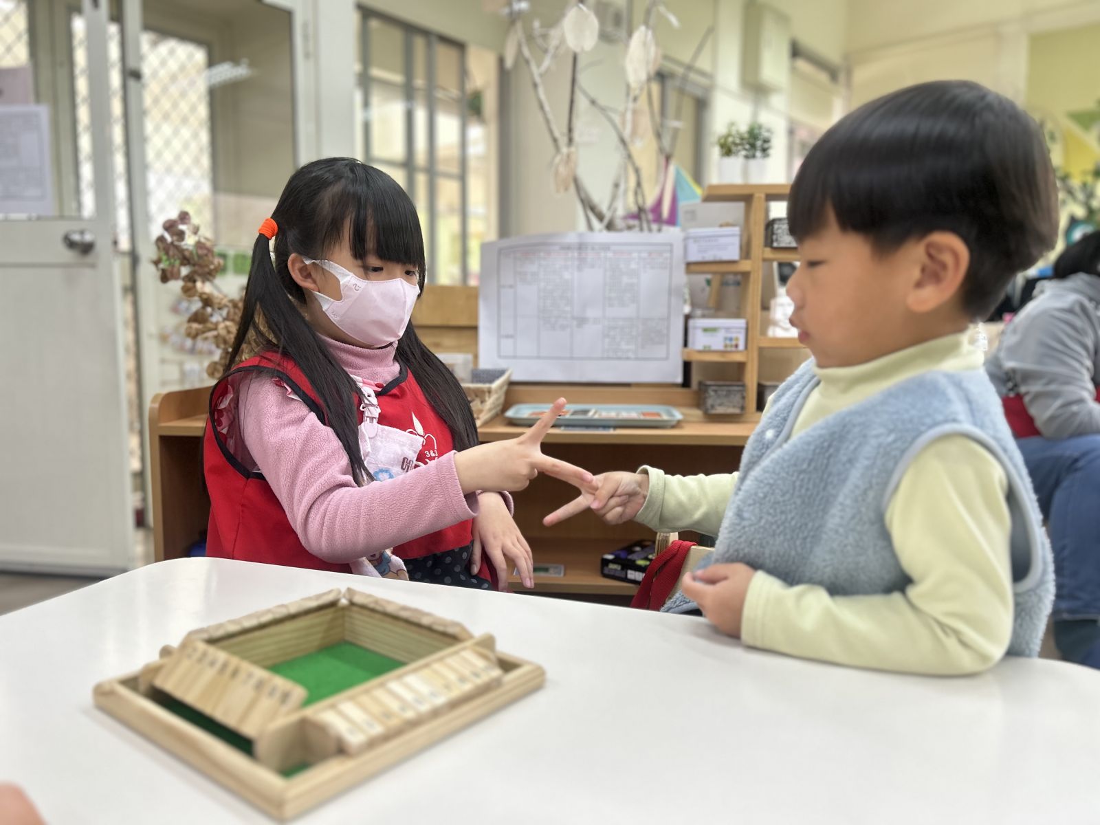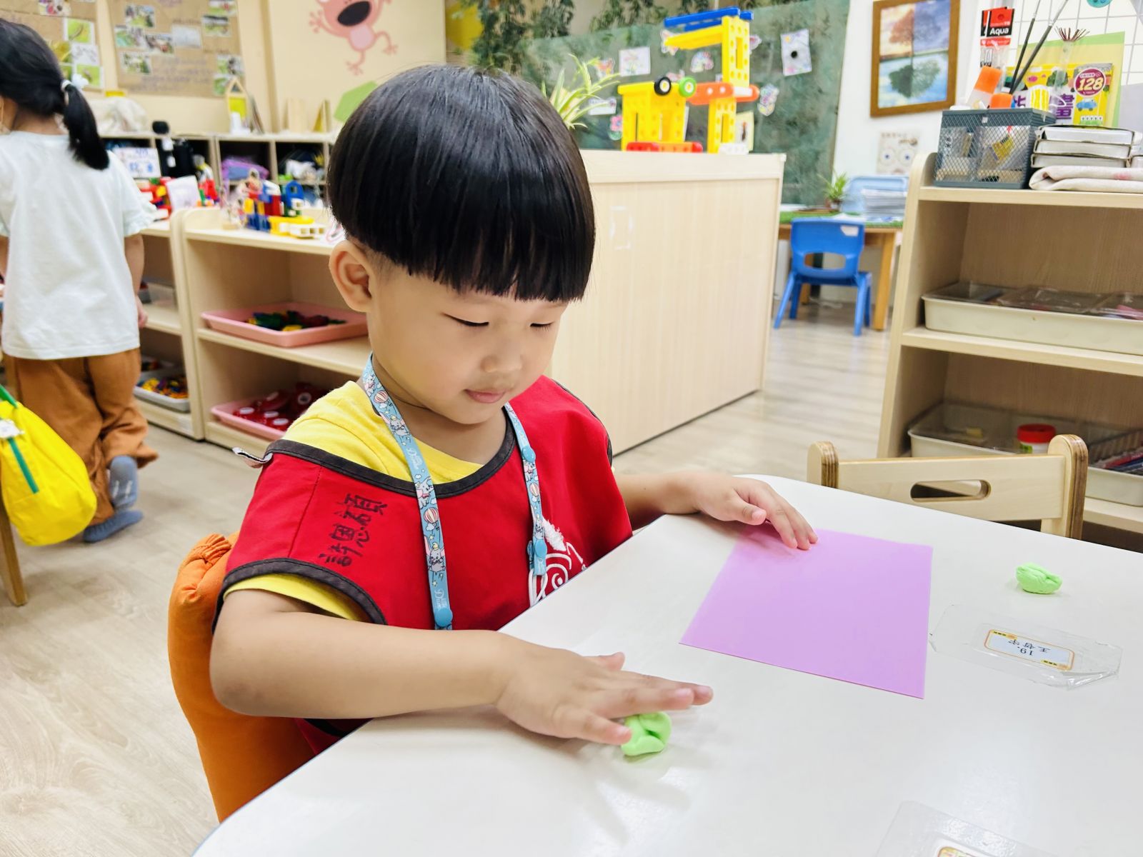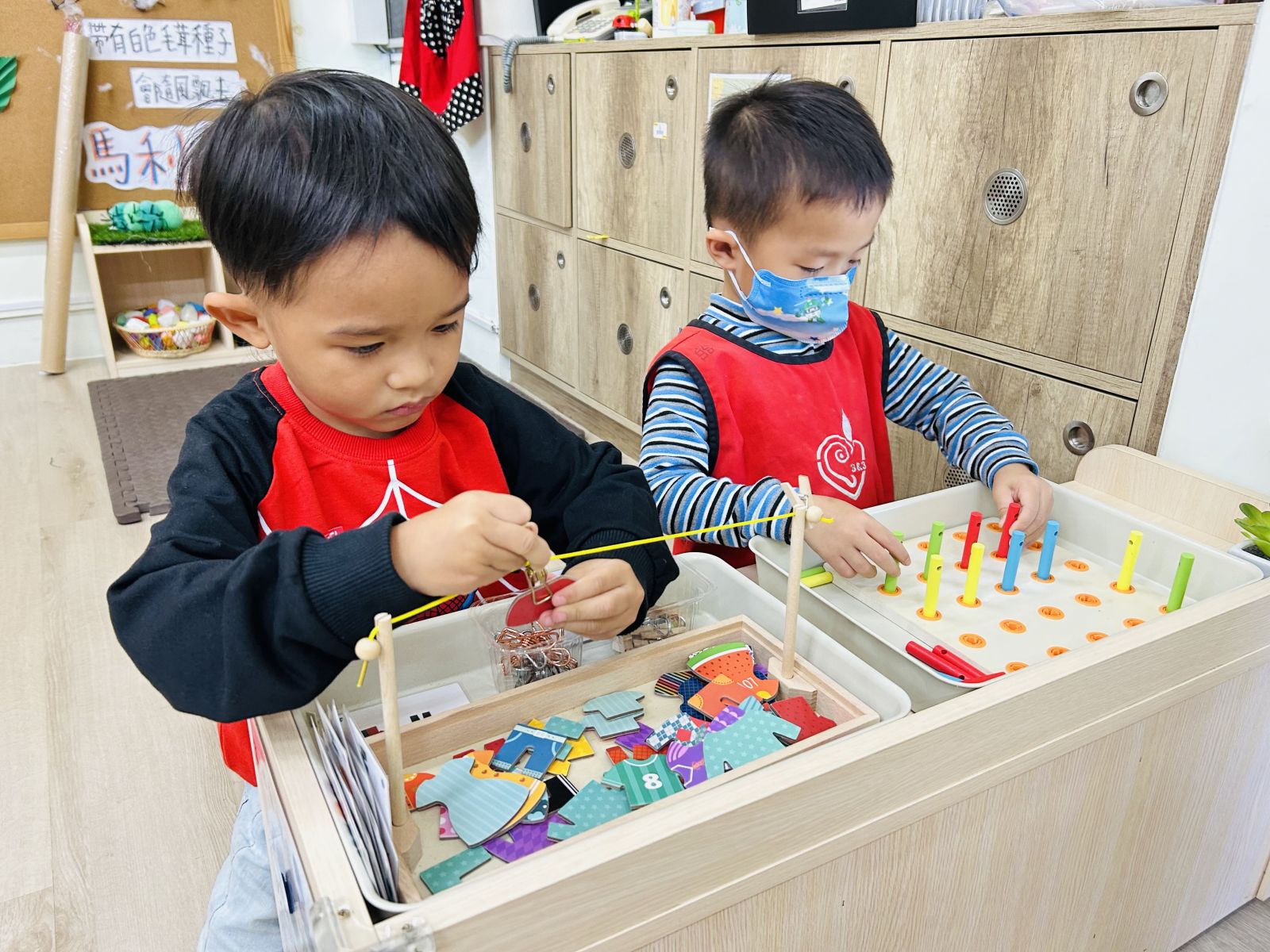 .孩子觀察圖片中的線索,並拿取正確的素材擺放在鐵盤上完成與圖片相同的作品,在過程中認識基本的顏色與形狀。