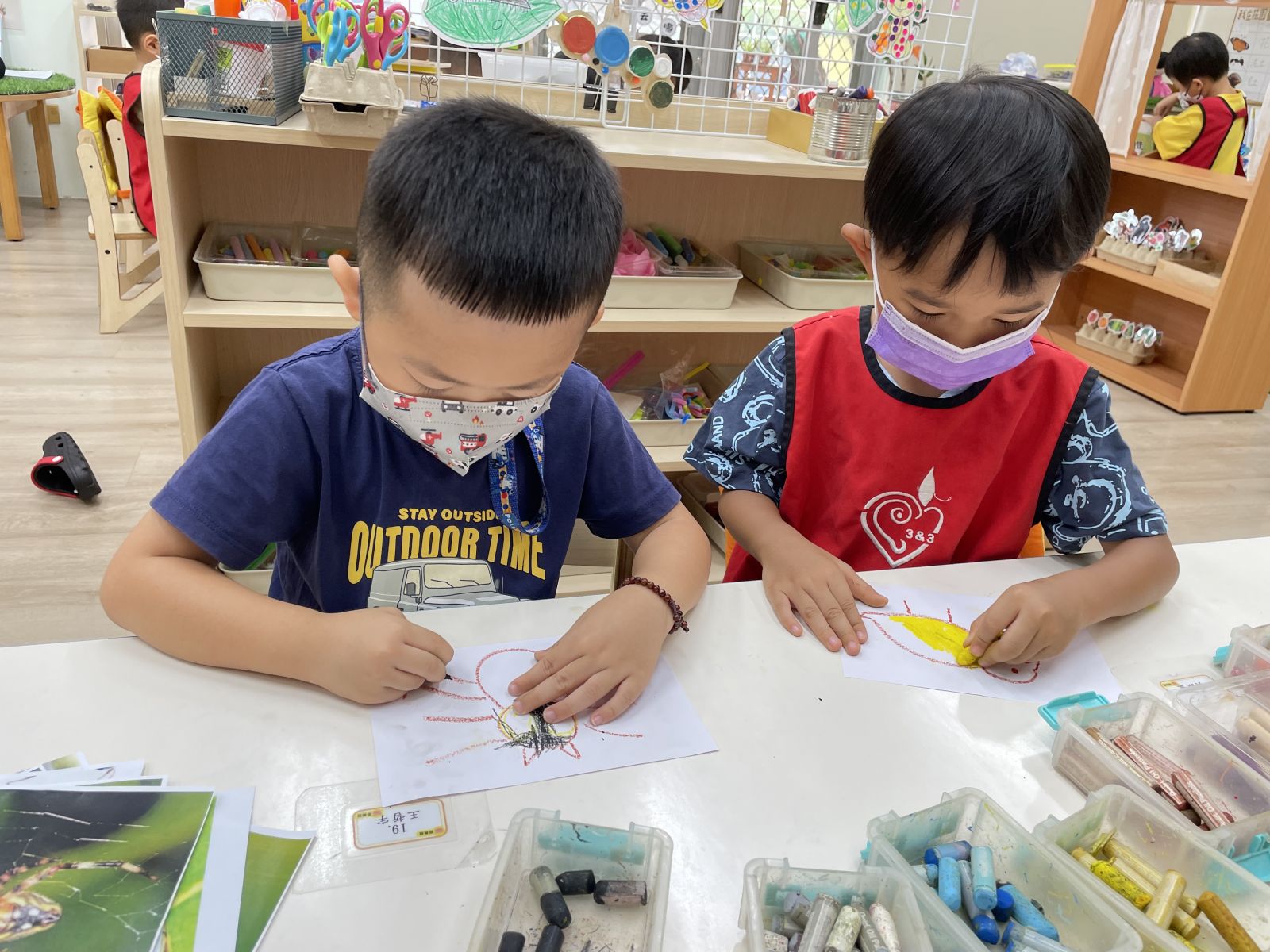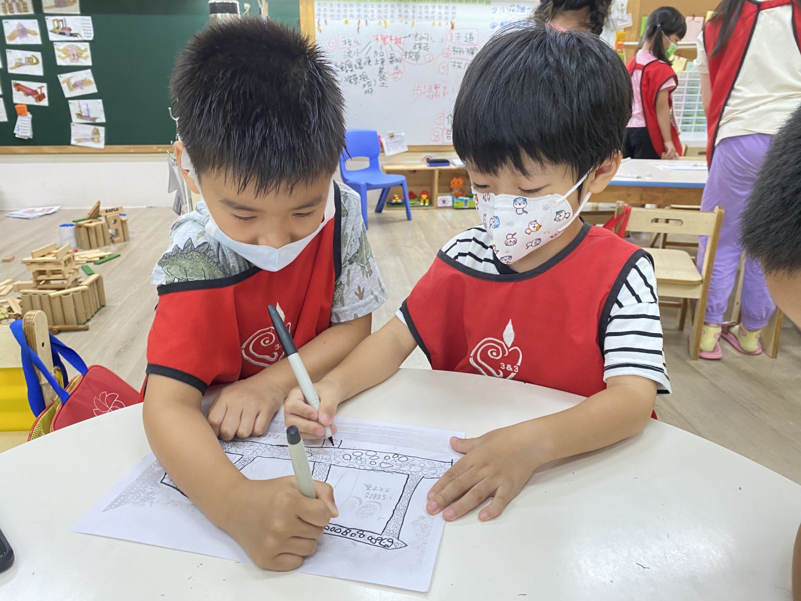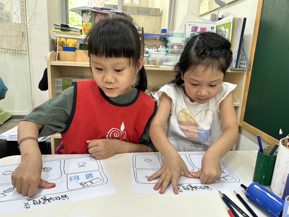 .幼兒們將自己的發現畫進空白繪本中。透過團體討論,創作出屬於自己組別的觀察記錄,並與其他組分享成果。