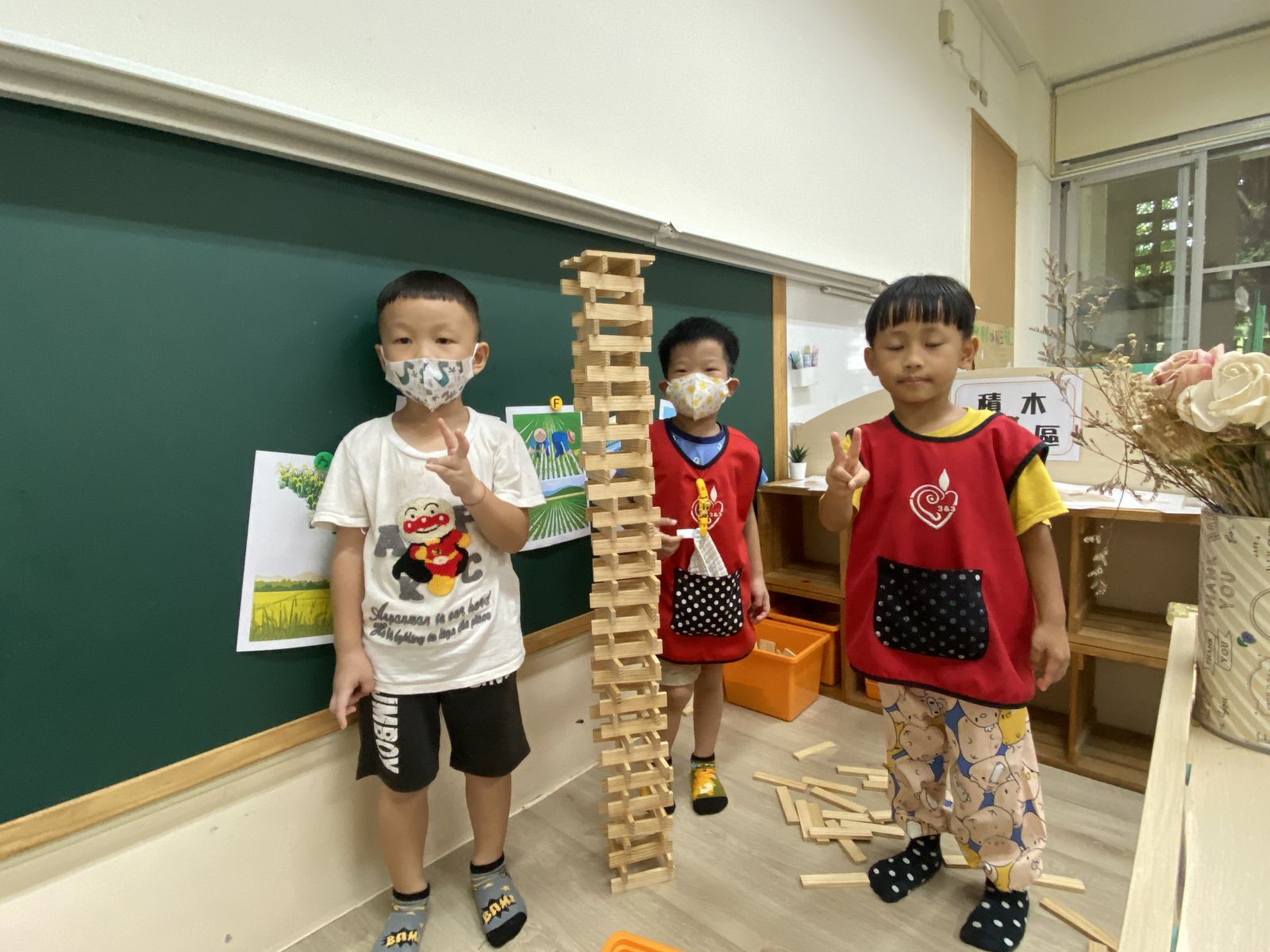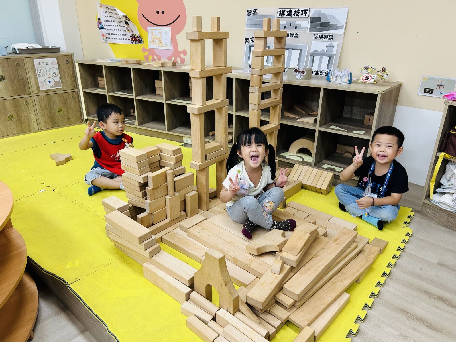 .孩子在搭建積木的過程中容易傾倒,卻有不敗的精神不斷挑戰,經過老師的引導,孩子成功疊出30樓高。