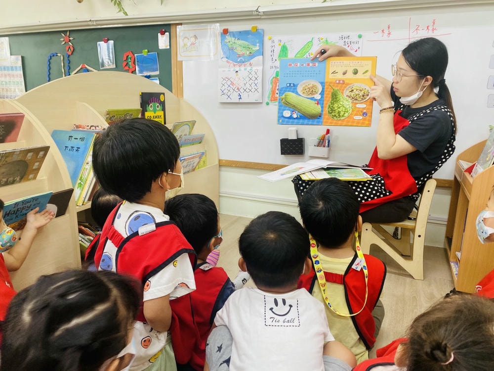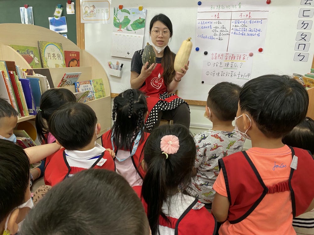 老師向幼兒說明絲瓜和蒲瓜的不同。