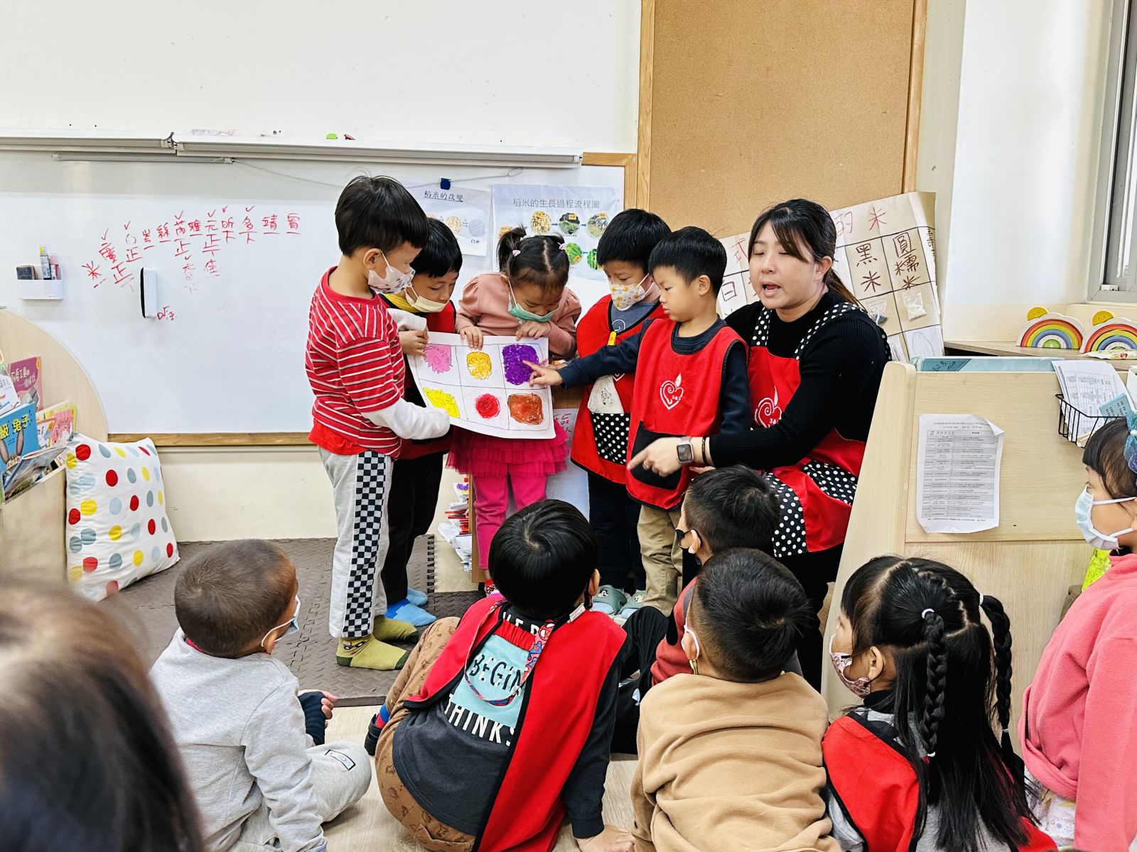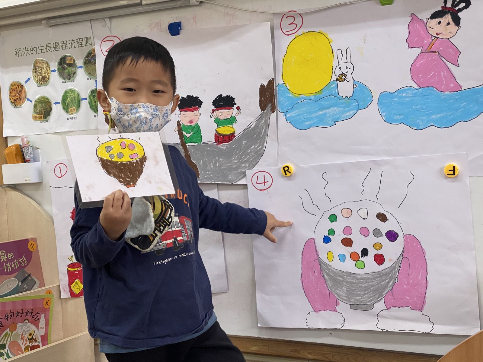 .透過繪本「米從哪裡來」,孩子從中覺知原來市場和超市的米是從水稻田中長出來後,才會送到市場或超市,老師也實際帶孩子到水稻田中實際探索,請孩子將觀察用圖像記錄並分享。