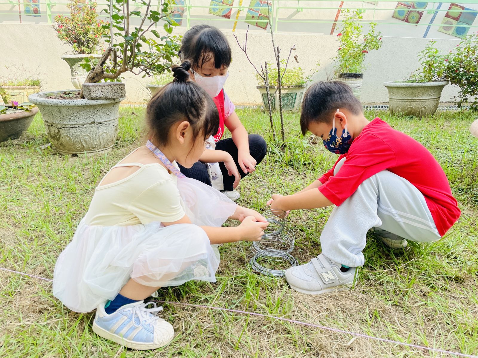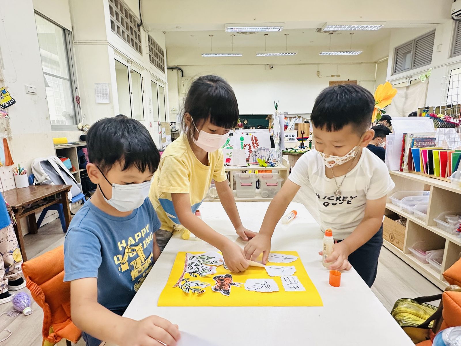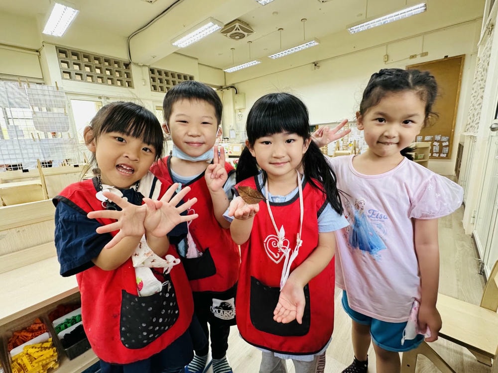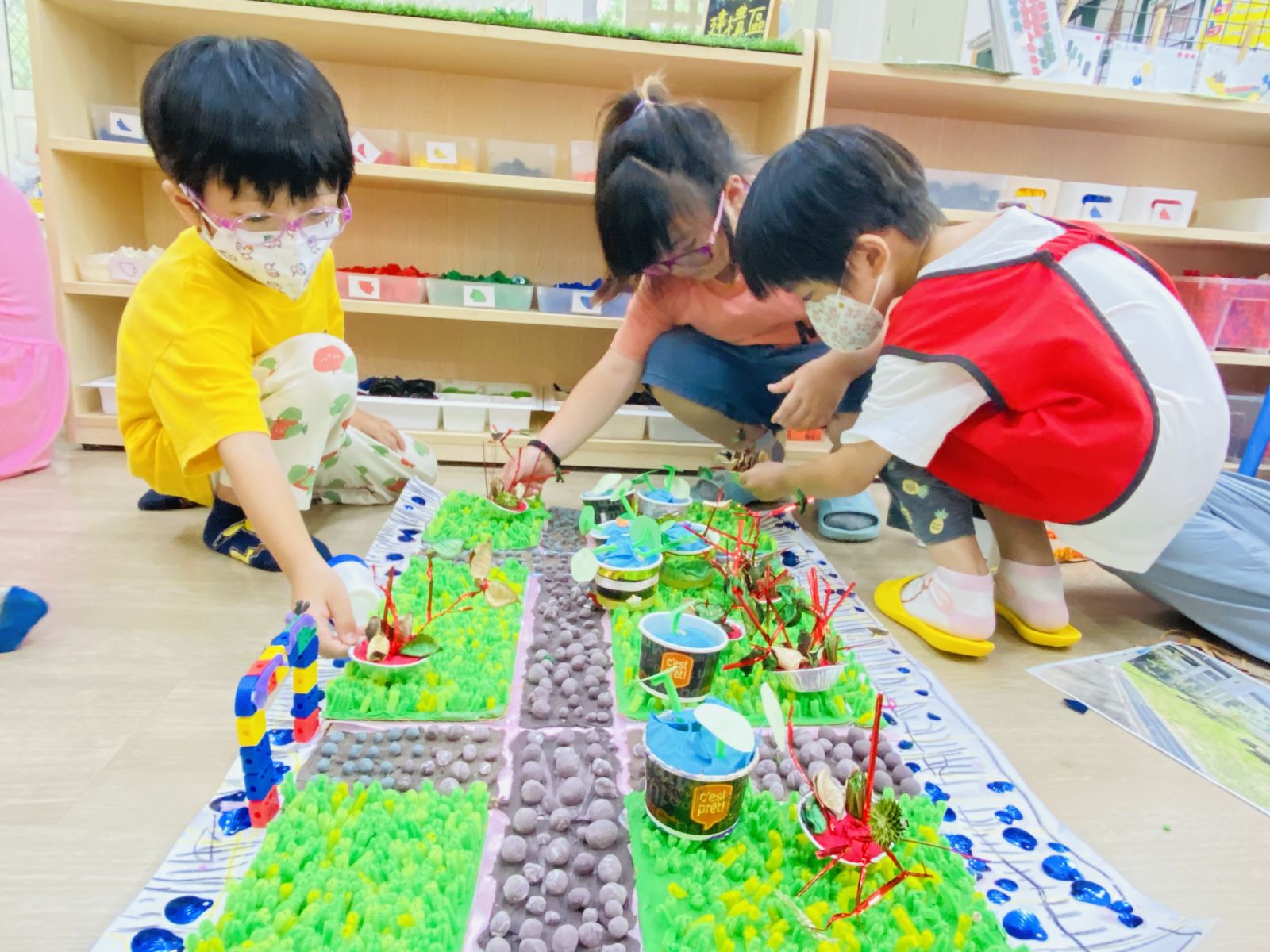 .當孩子們將毛毛蟲放回花園並再次前往觀察時,因連日降雨,花園雜草叢生,毛毛蟲的家變得空空的。於是孩子開始討論並分組進行剪貼、塗畫及立體構成,發揮豐富想像力,打造一個安全又舒適的環境。