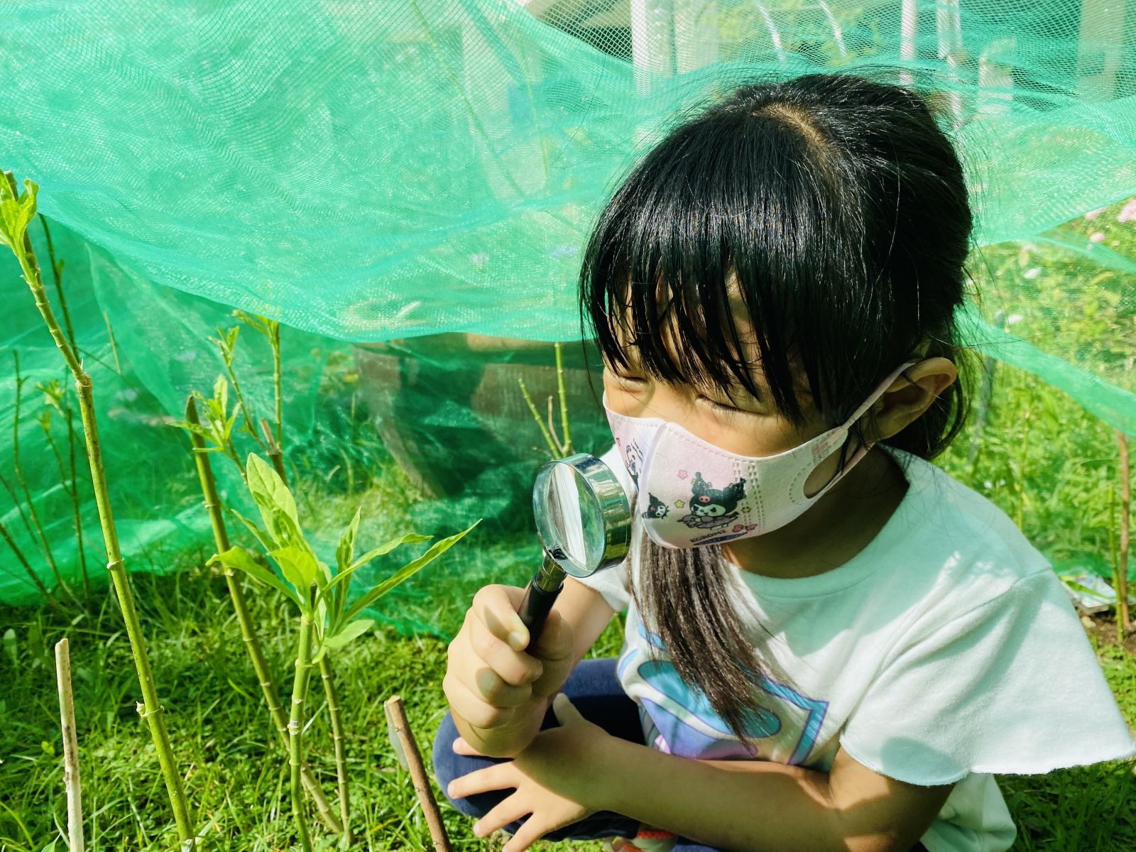 出發到後花園、菜園尋找蝴蝶的卵,過程中孩子不僅會保護自身安全外,厲害的雙眼在葉片下找到了極小的卵。