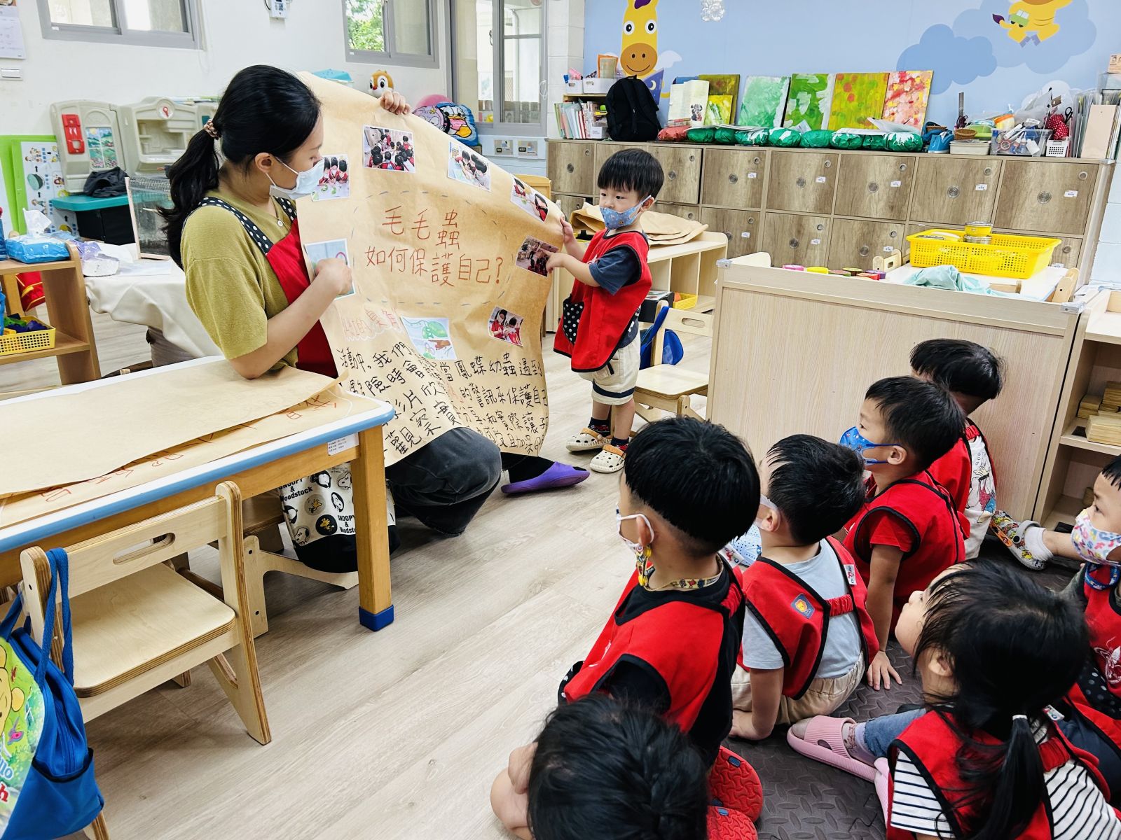 藉由繪本「超級蟲蟲」,孩子們從故事內容以及書中各種小動物的圖片來辨識牠們的情緒,也發現了原來鳥類會攻擊毛毛蟲。