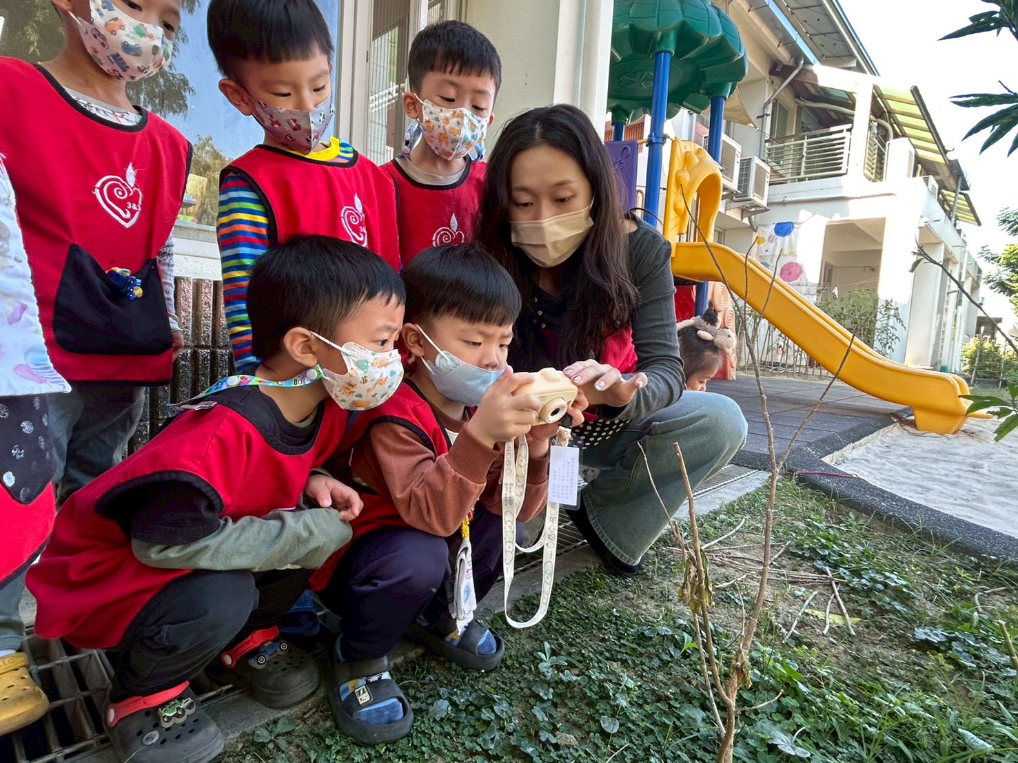 .孩子提出使用放大鏡或靠近觀看的想法並由有經驗的孩子示範放大鏡的使用方式。孩子們學習正確拿取與調整角度,練習讓畫面更清晰,同時也提醒彼此觀察時要保持距離、動作輕柔,避免驚擾昆蟲。
