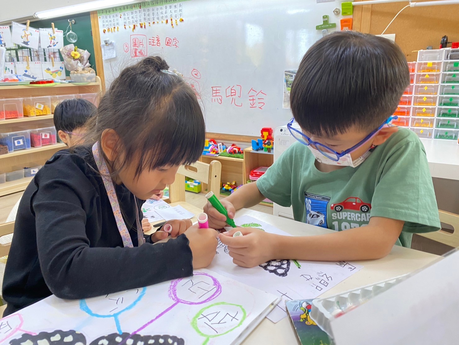 .透過著色用具將孩子們分為:彩色筆、顏料、黏土三個組別,孩子們運用毛根、彩帶、毛球...等素材,創作出屬於自己的「彩色怪獸」。