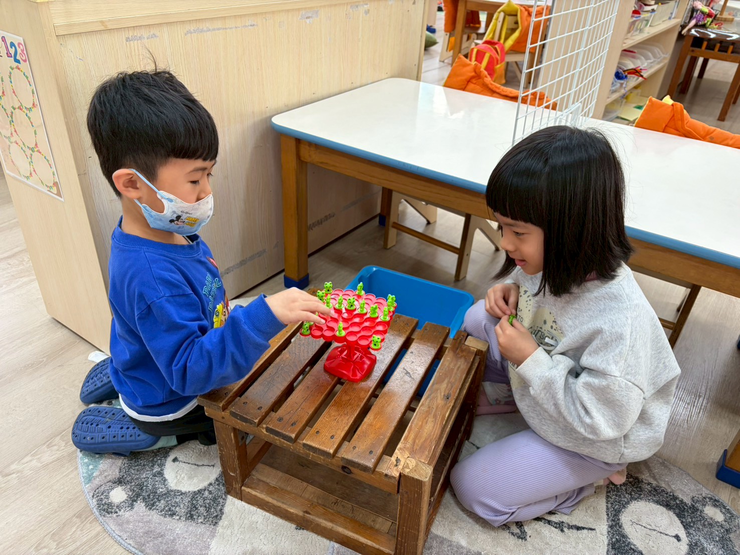 .透過圖卡提示,使用夾子夾出圓球,排出顏色序列的毛毛蟲。