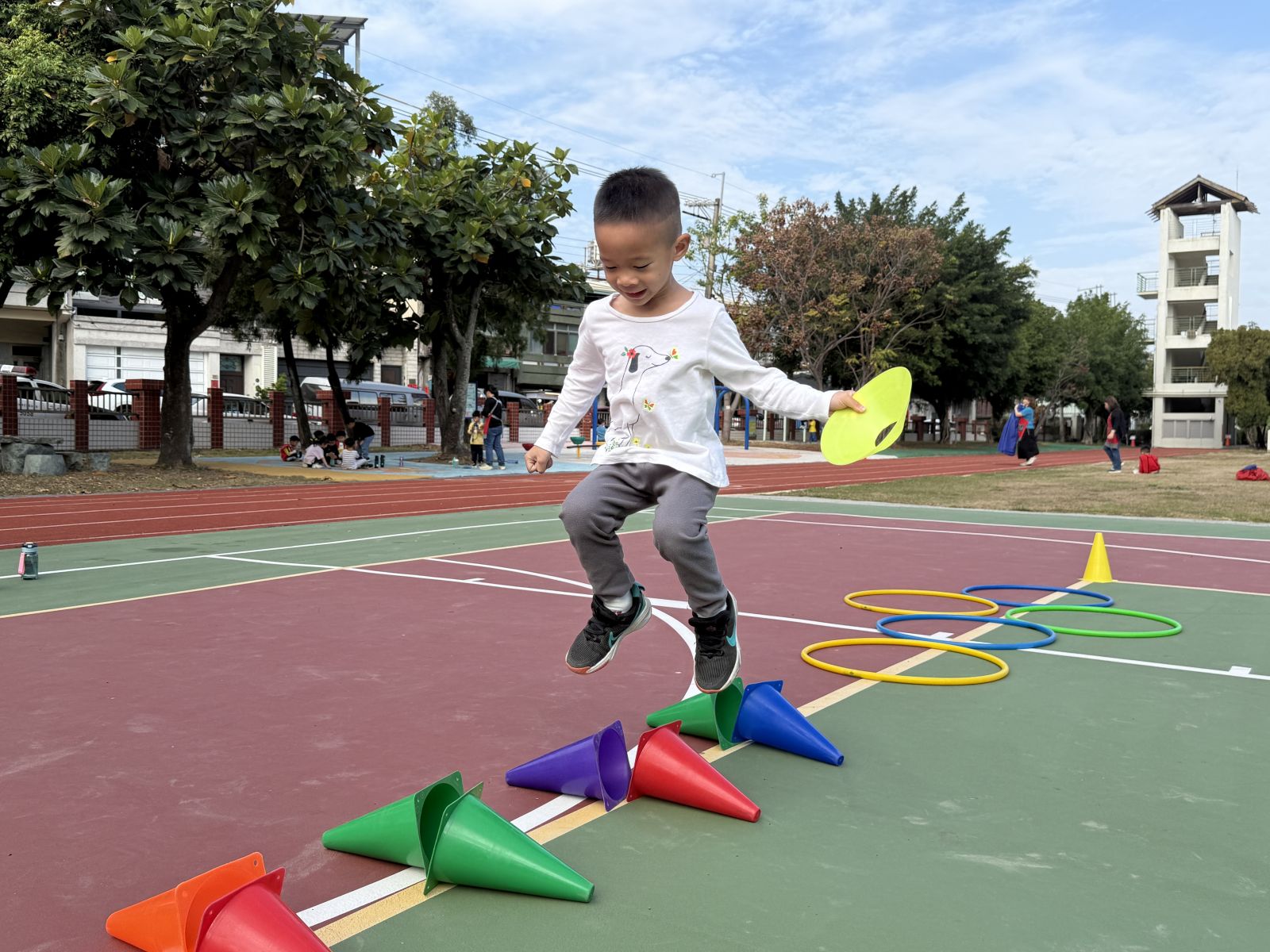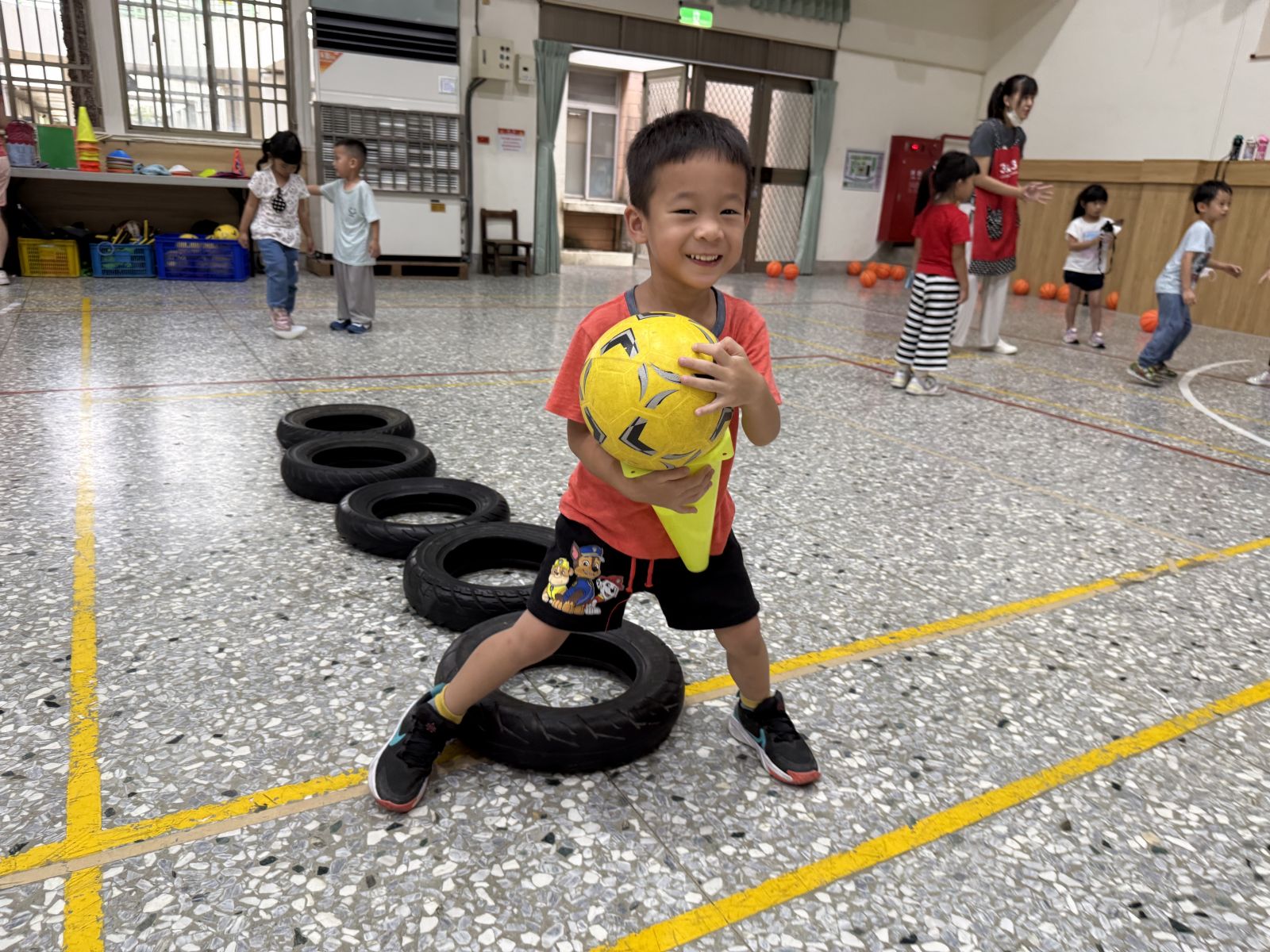 .我的手腳真厲害,手裡拿著裝足球的三角錐走輪胎。