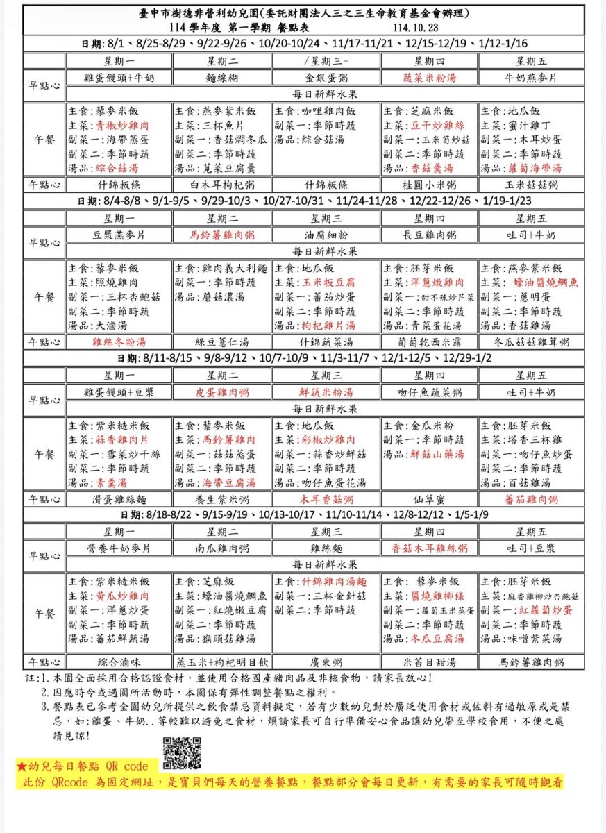 114學年 上學期 餐點表 (114.10.23因應非洲豬瘟修改餐點表,此餐點表至