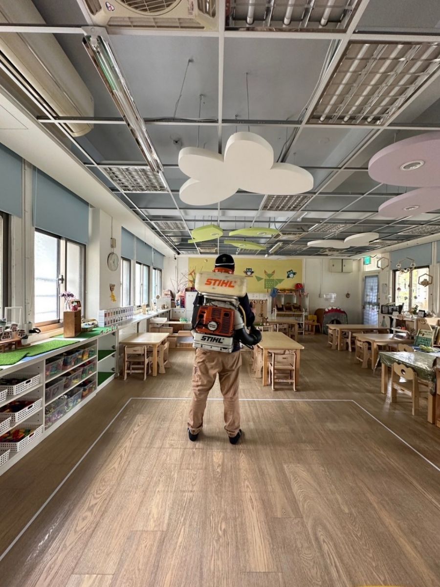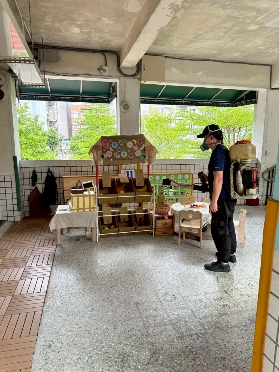 因應期中防疫措施,為加強校園環境衛生,請專業廠商安排人員前來本園進行全面性消毒作業,尤其針對教室、廁所及遊戲區等幼兒頻繁活動區域,確保幼童健康安全。