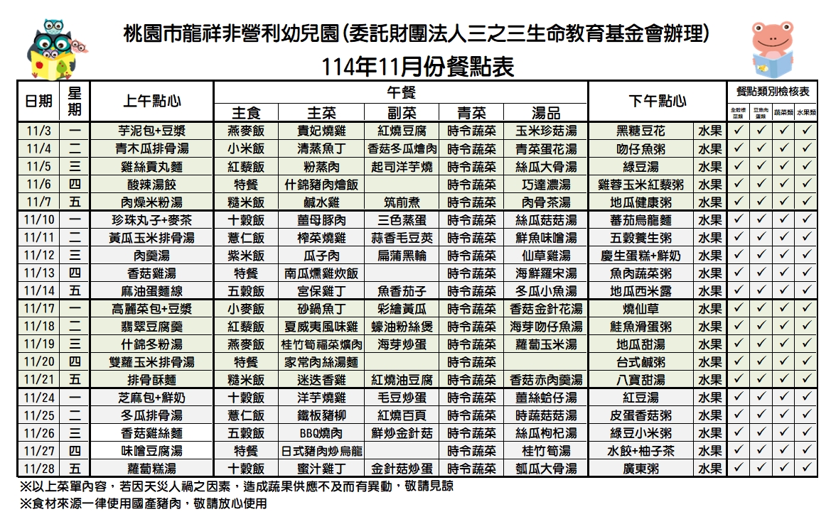 114年十一月份餐點表