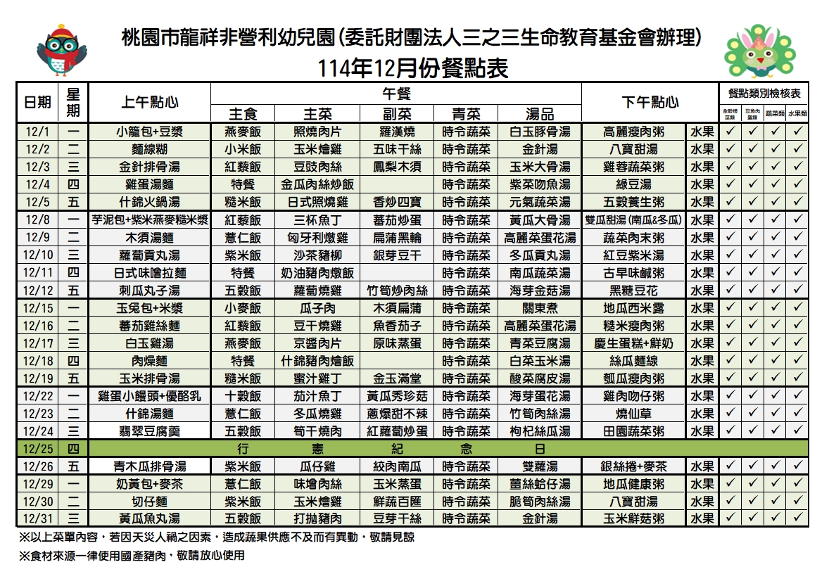 114年十二月份餐點表