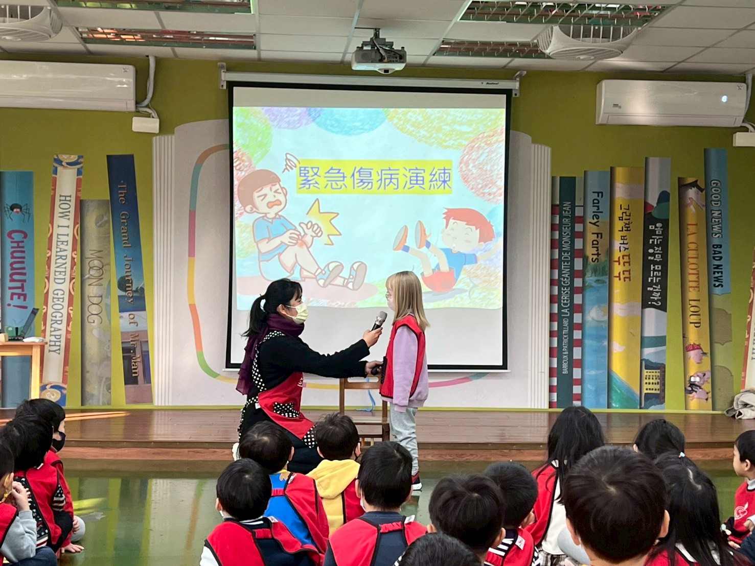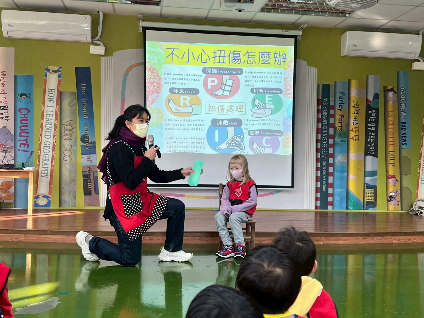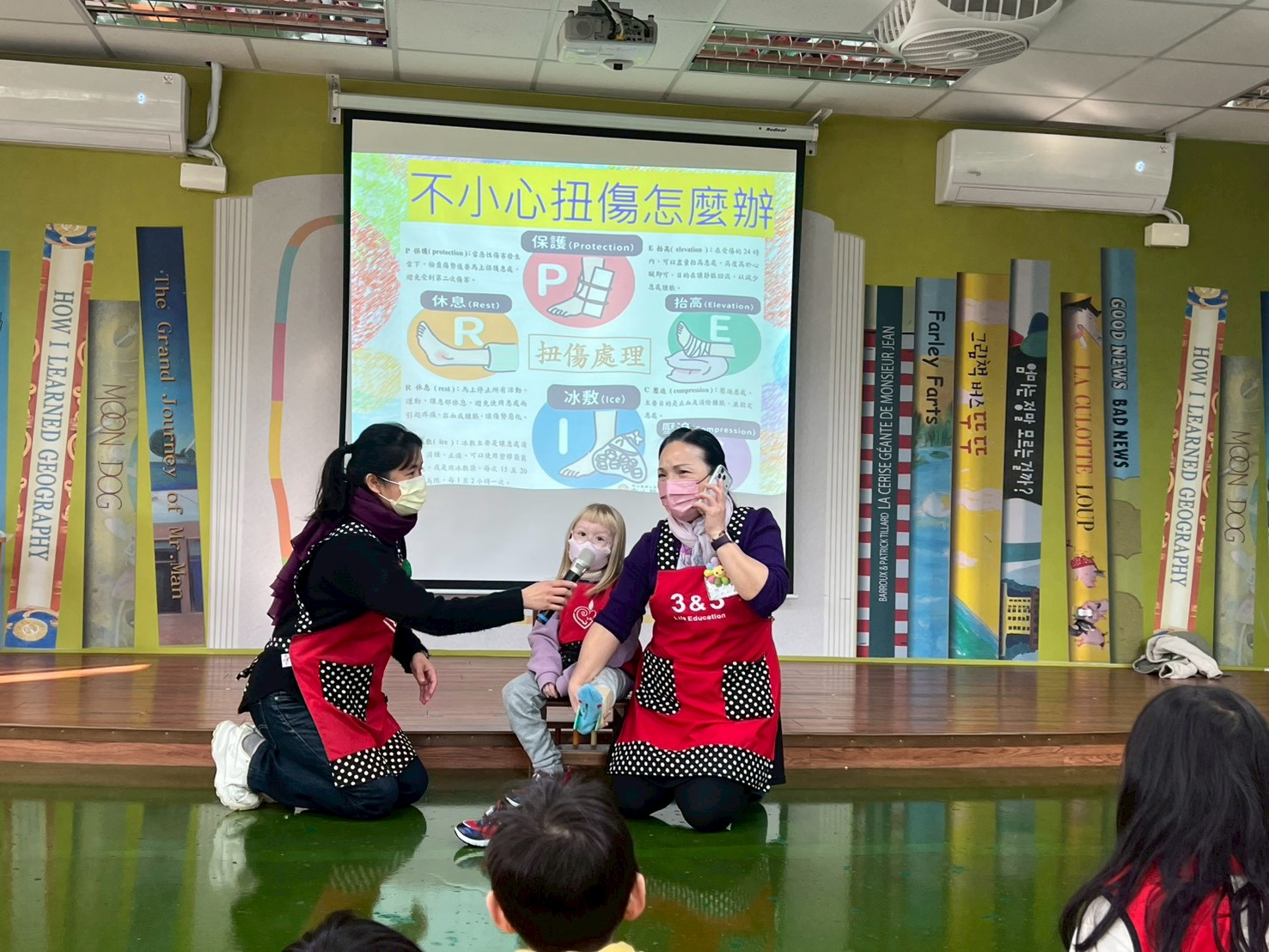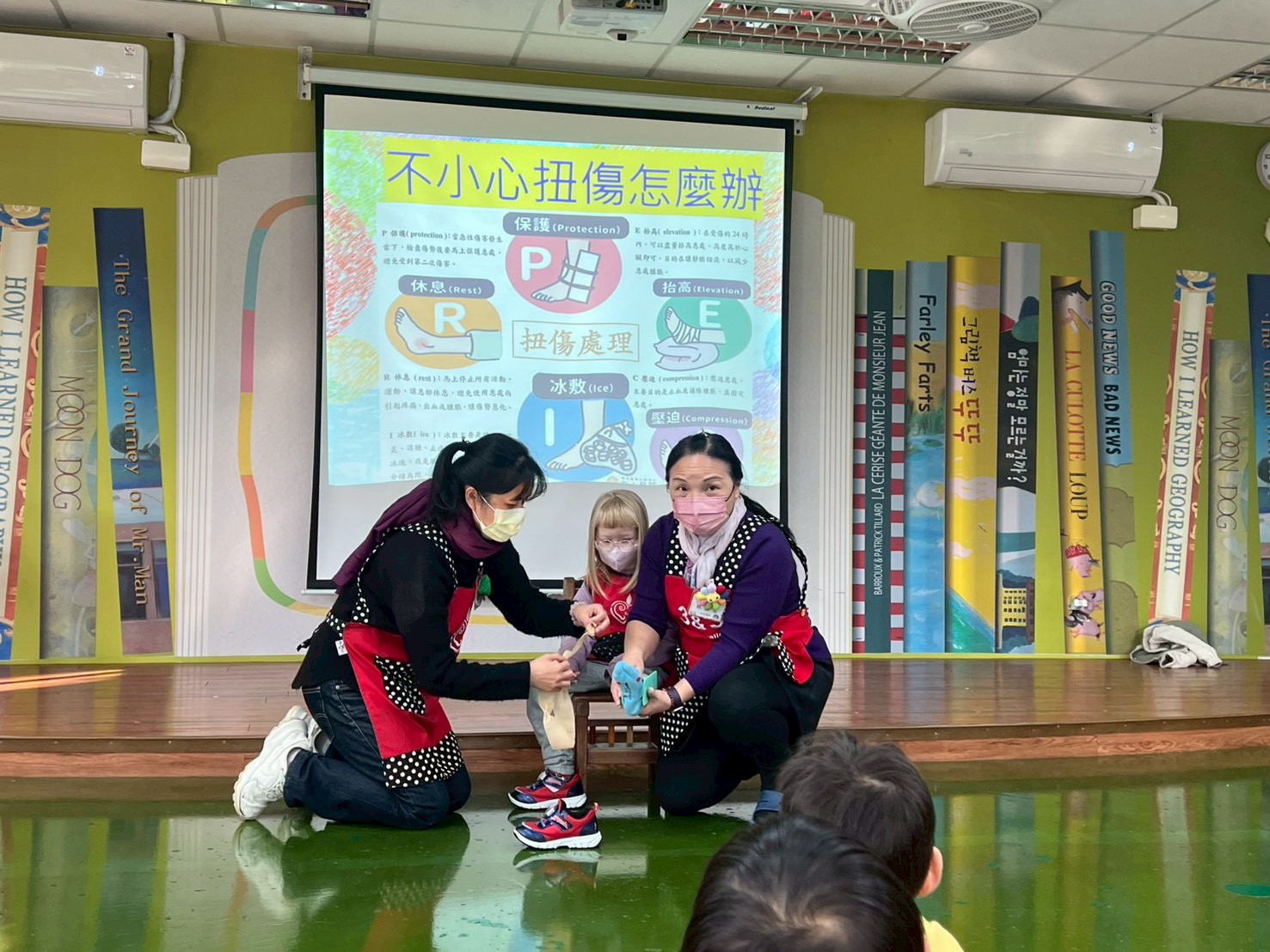在疏散時若有幼生跌倒,由行政人員評估進行止血動作,並食鹽水清潔消毒傷口,用紗布包紮傷口並致電通知家長。
