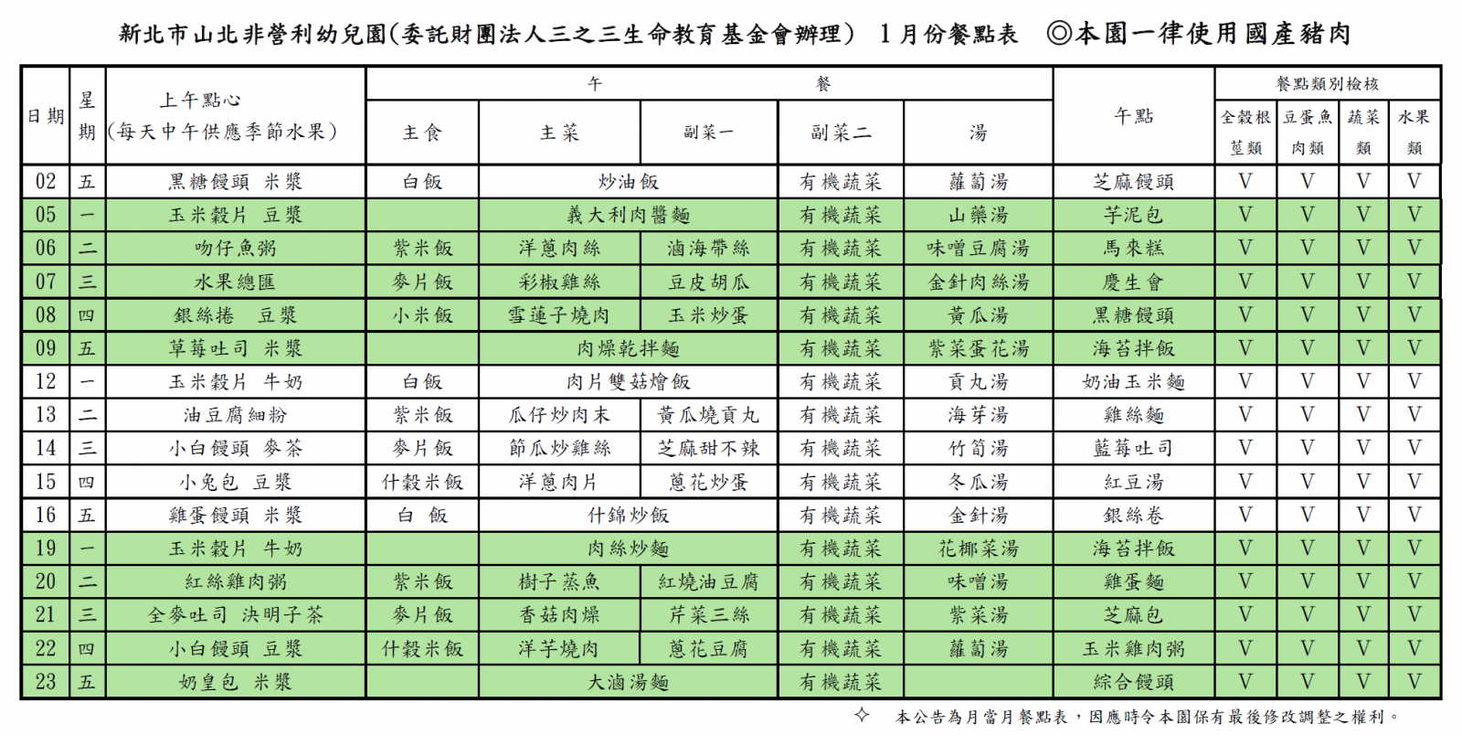 114學年度第一學期 一月份菜單