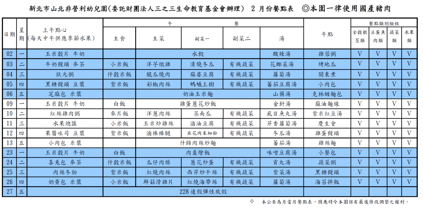 114學年度第一學期 二月份菜單