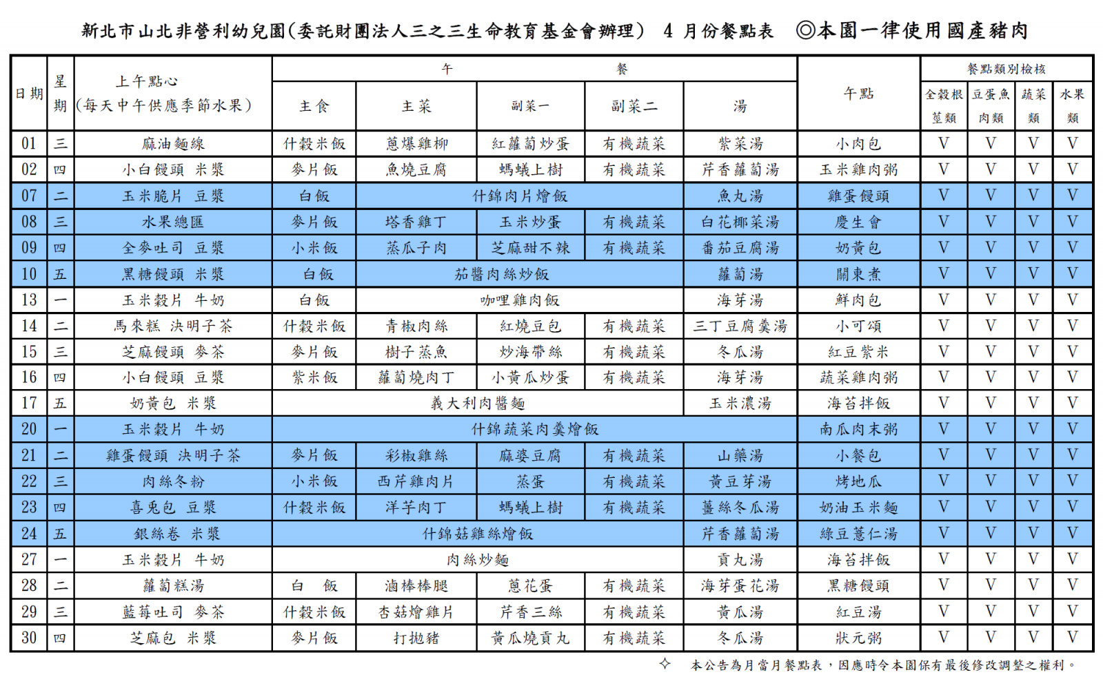 114學年度第一學期 四月份菜單