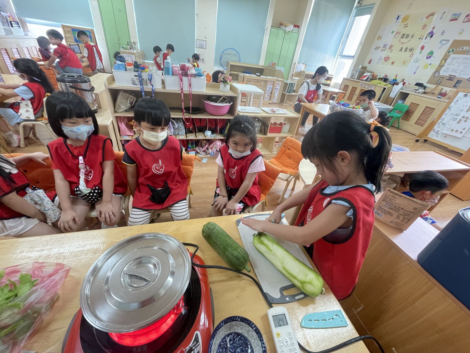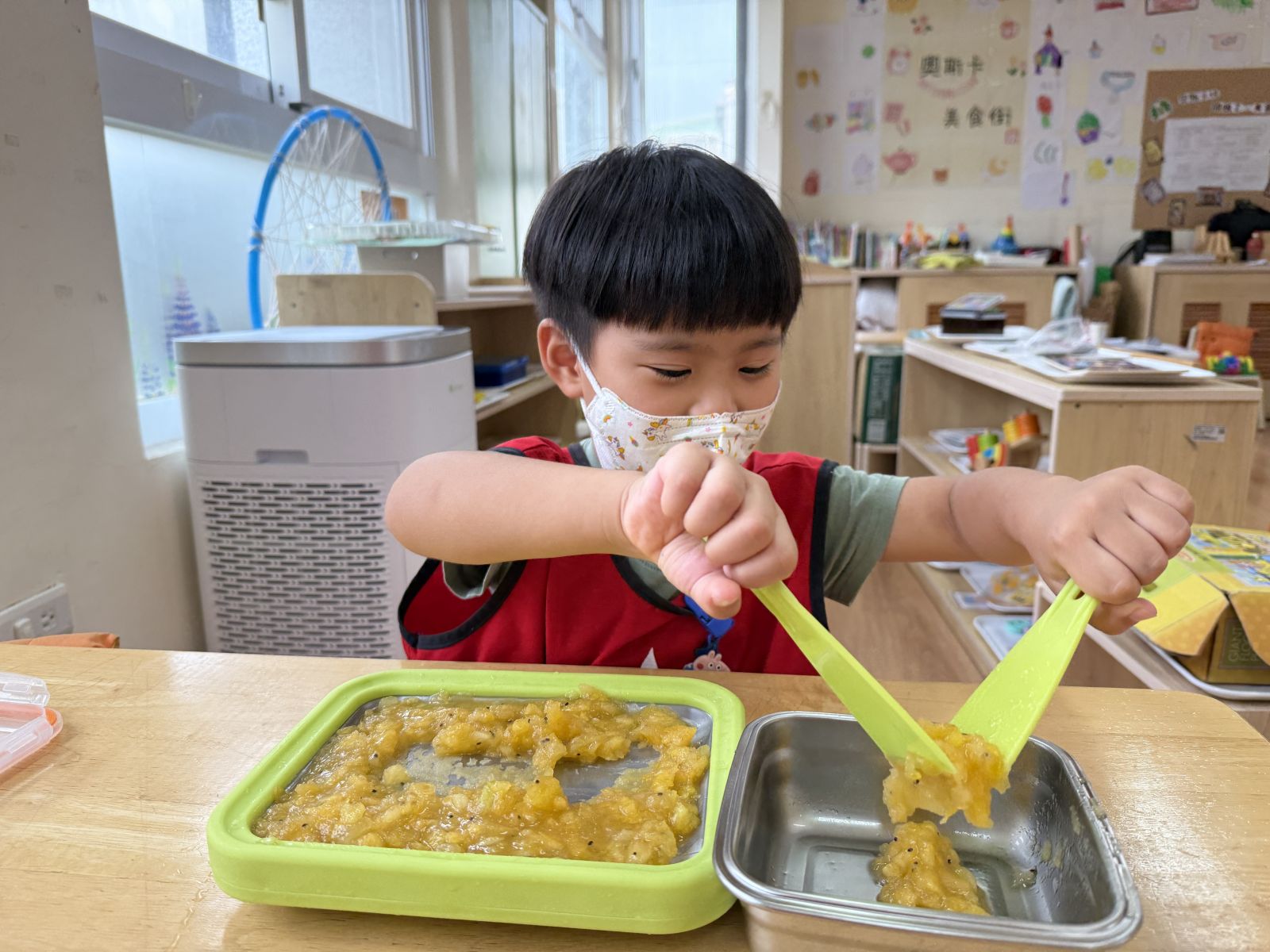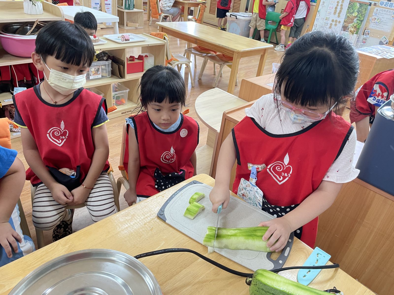 主題課程中介紹基本功學習抓握、切、攪拌、倒水等基礎烹飪技能,提升手部控制力,辨別生活環境中能做或不能做的事,嘗試操作煮菜流程,發現問題時孩子能主動詢問老師或是同儕唷!