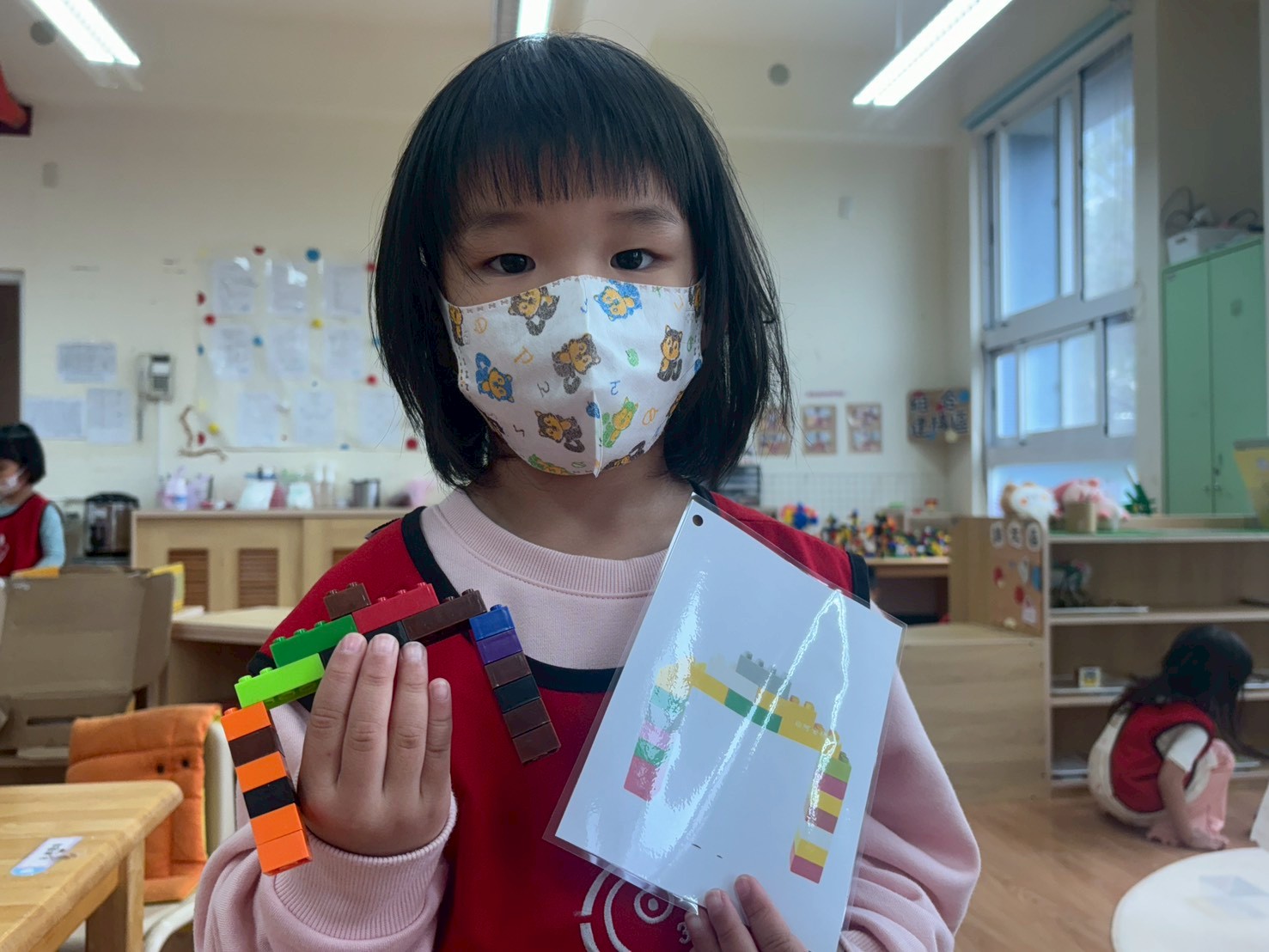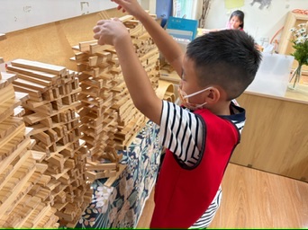 孩子們運用積木區提供的範例圖進行建構挑戰,過程中若遇到困難,能主動尋求同儕協助,展現良好的合作與解決問題能力。