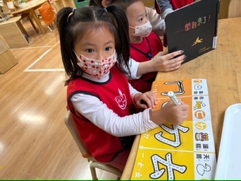 語文區新增了注音點讀筆內容,孩子們可一邊聆聽一邊跟讀,並運用鬆散素材拼出注音符號,在操作中增進對符號的熟悉與興趣。同時也提供描線練習,讓孩子練習書寫自己的名字,培養控筆與運筆的穩定度。