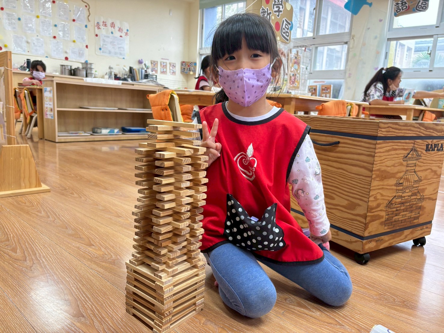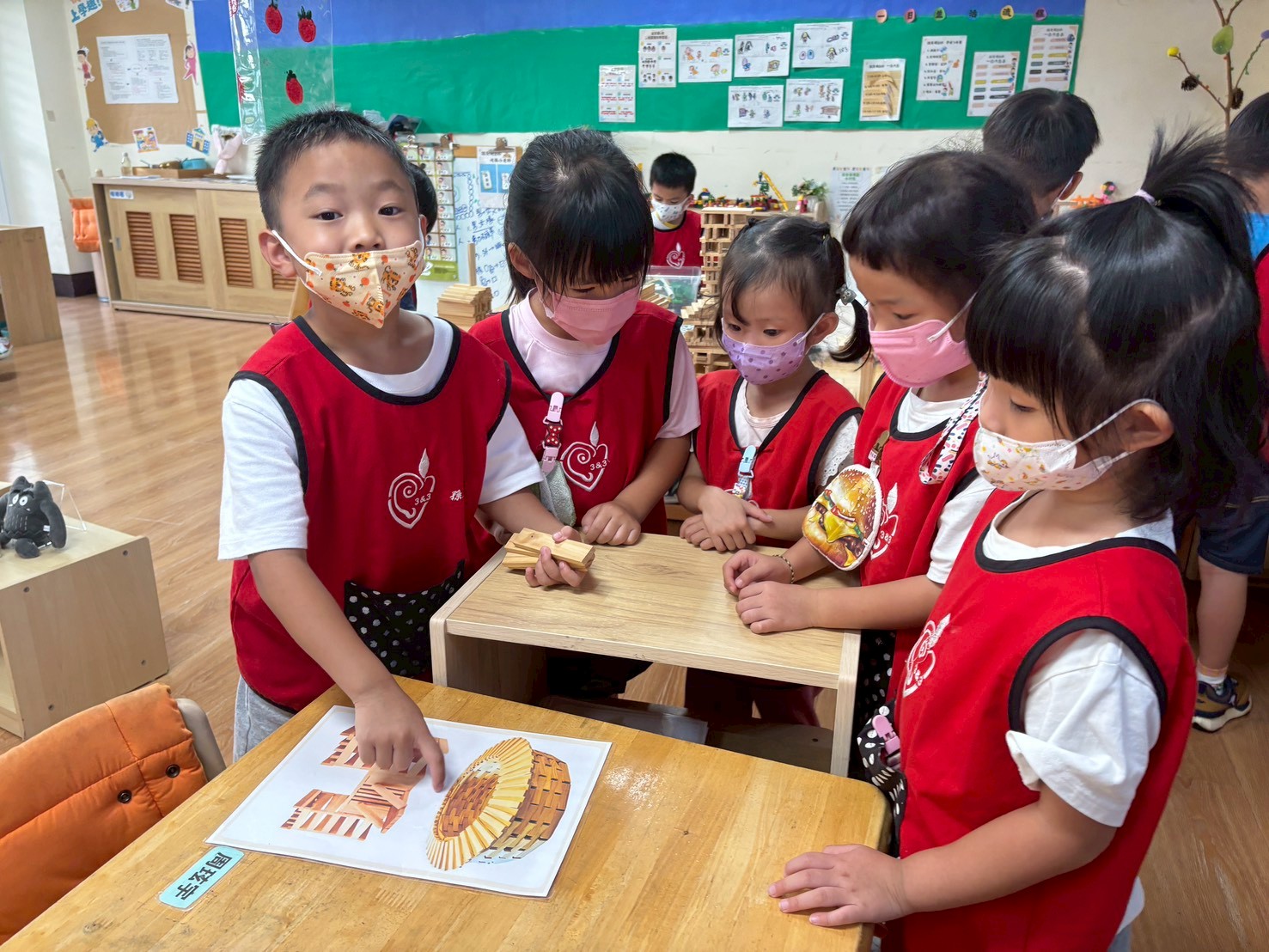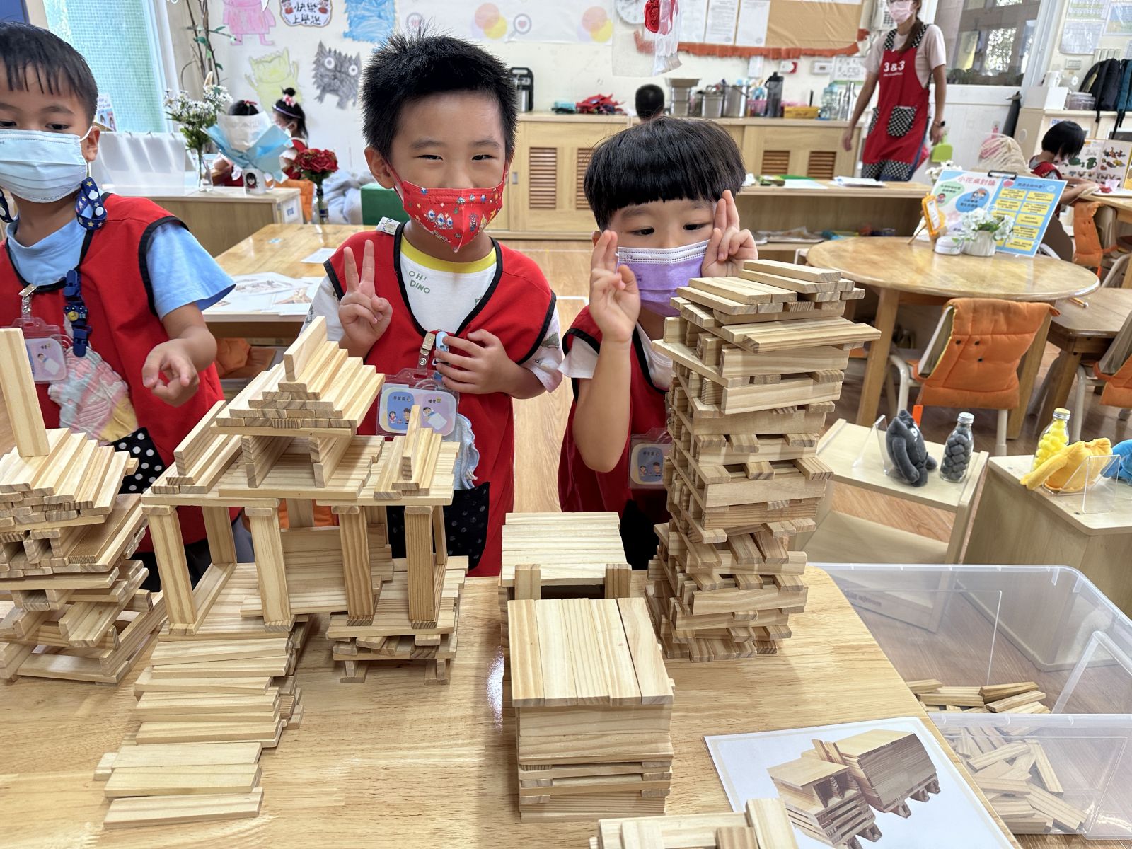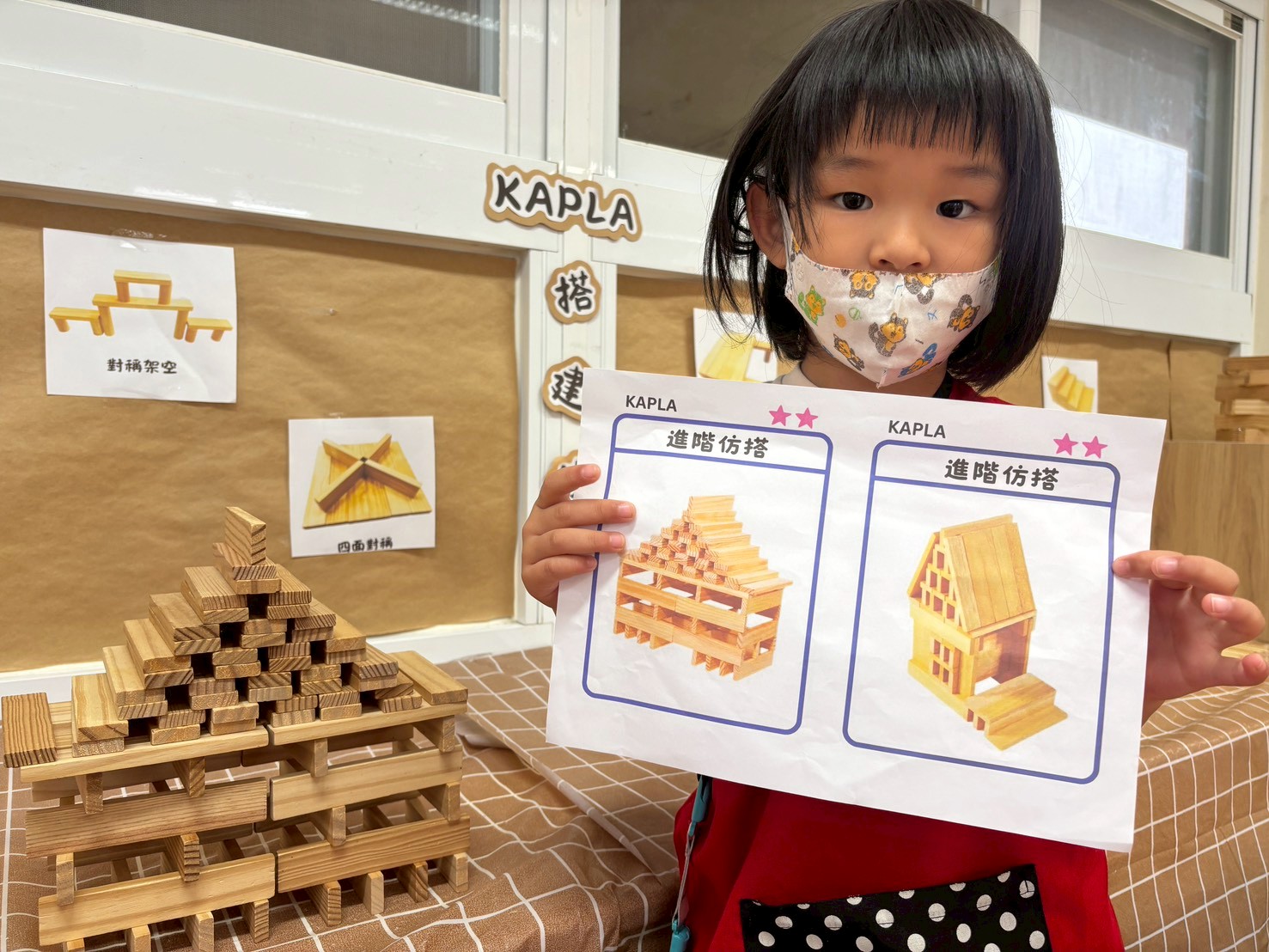 孩子們在Kapla區觀察圖鑑上的塔,並根據重點復刻學校模型。他們巧妙地利用積木搭建出具建築特色的作品。這過程不僅激發了創意,也培養了孩子們的空間思維與手眼協調能力。