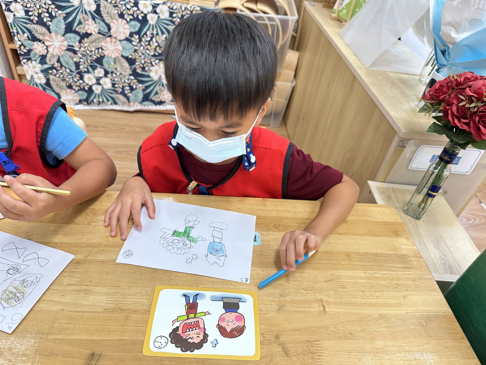孩子在美勞區先嘗試仿畫多種小人物,仔細觀察特徵並調整線條比例,而黏土進行捏塑創作,透過反覆塑形、壓揉與加細節的方式展現創意與細部動作控制,過程中表現出專注力、耐心與藝術表達能力。