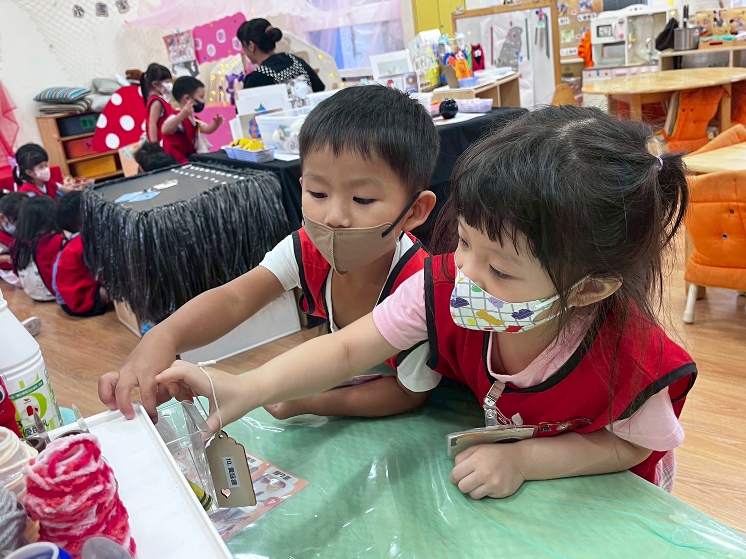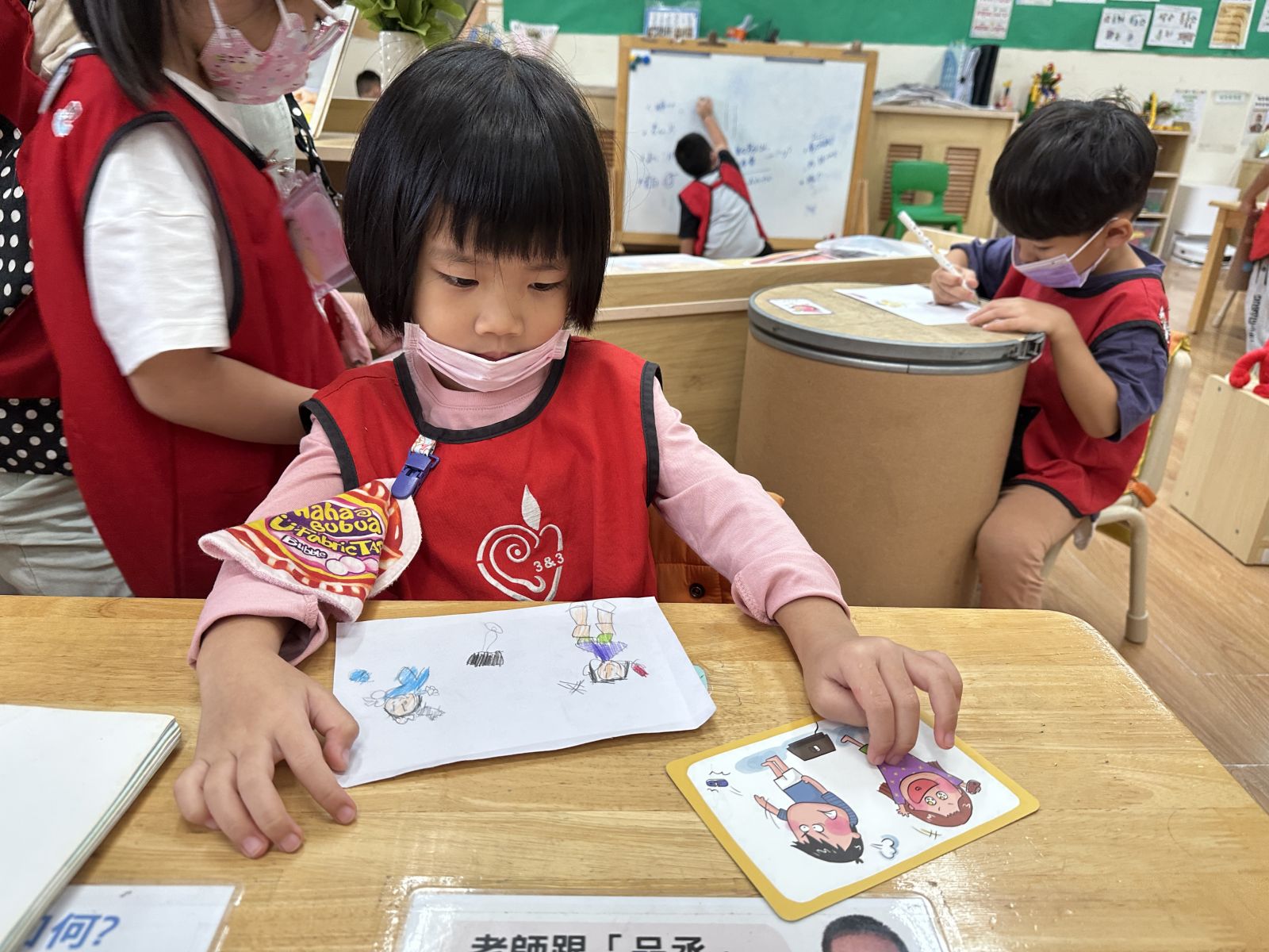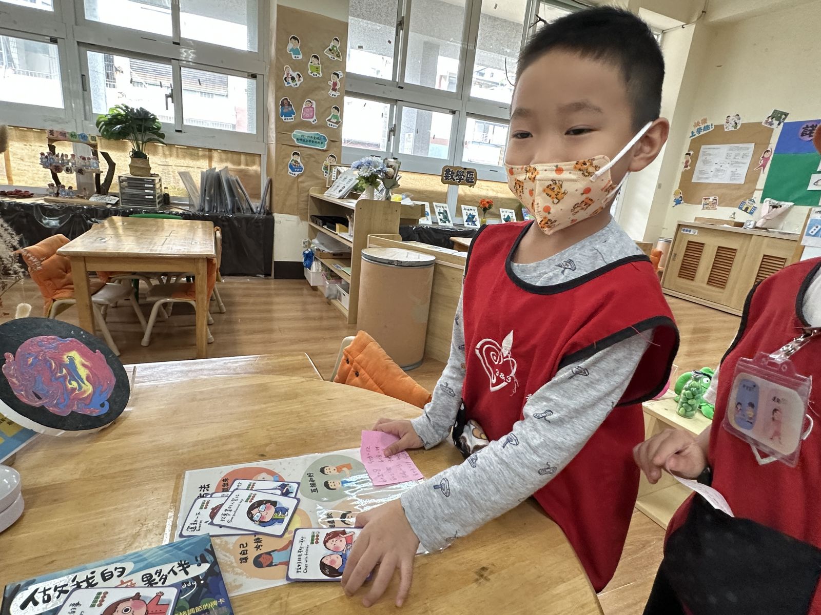 孩子在闖關活動中帶著弟弟妹妹一起思考「情緒是什麼顏色」,並透過翻找情緒卡牌與情緒繪本來辨識與討論不同情緒。接著挑戰哥哥姊姊的學習區關卡,一同合作完成任務,過程中展現帶領能力、合作技巧與情緒理解能力。