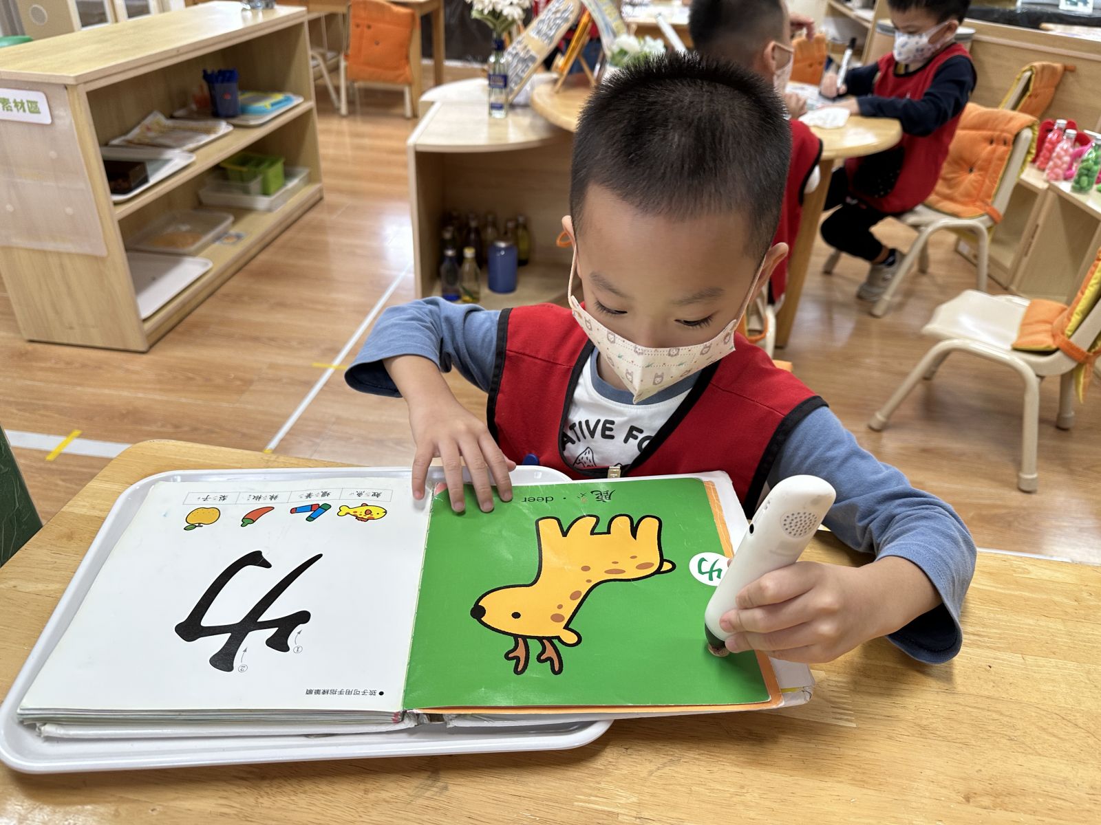 孩子們透過故事繪本搭配故事CD內容說明,更能融入情境中,在教具點讀筆錄製小段的故事內容,已聽到的,跟自己說出來的有甚麼不同呢?提升孩子對於語文區內的操作興趣唷!