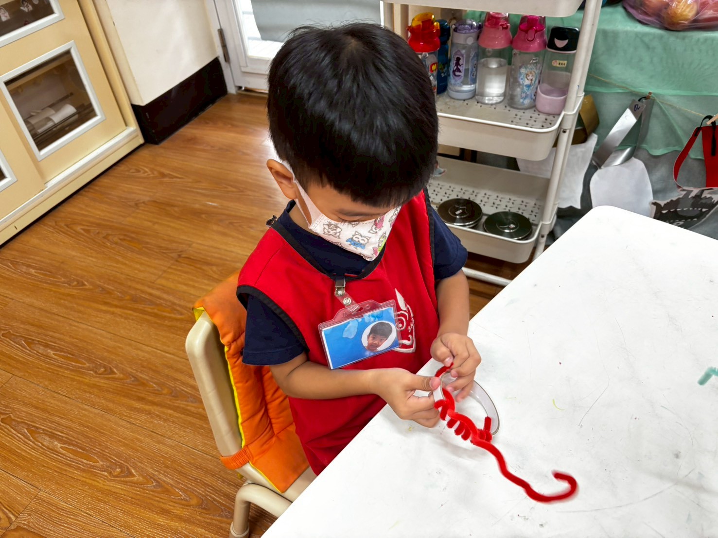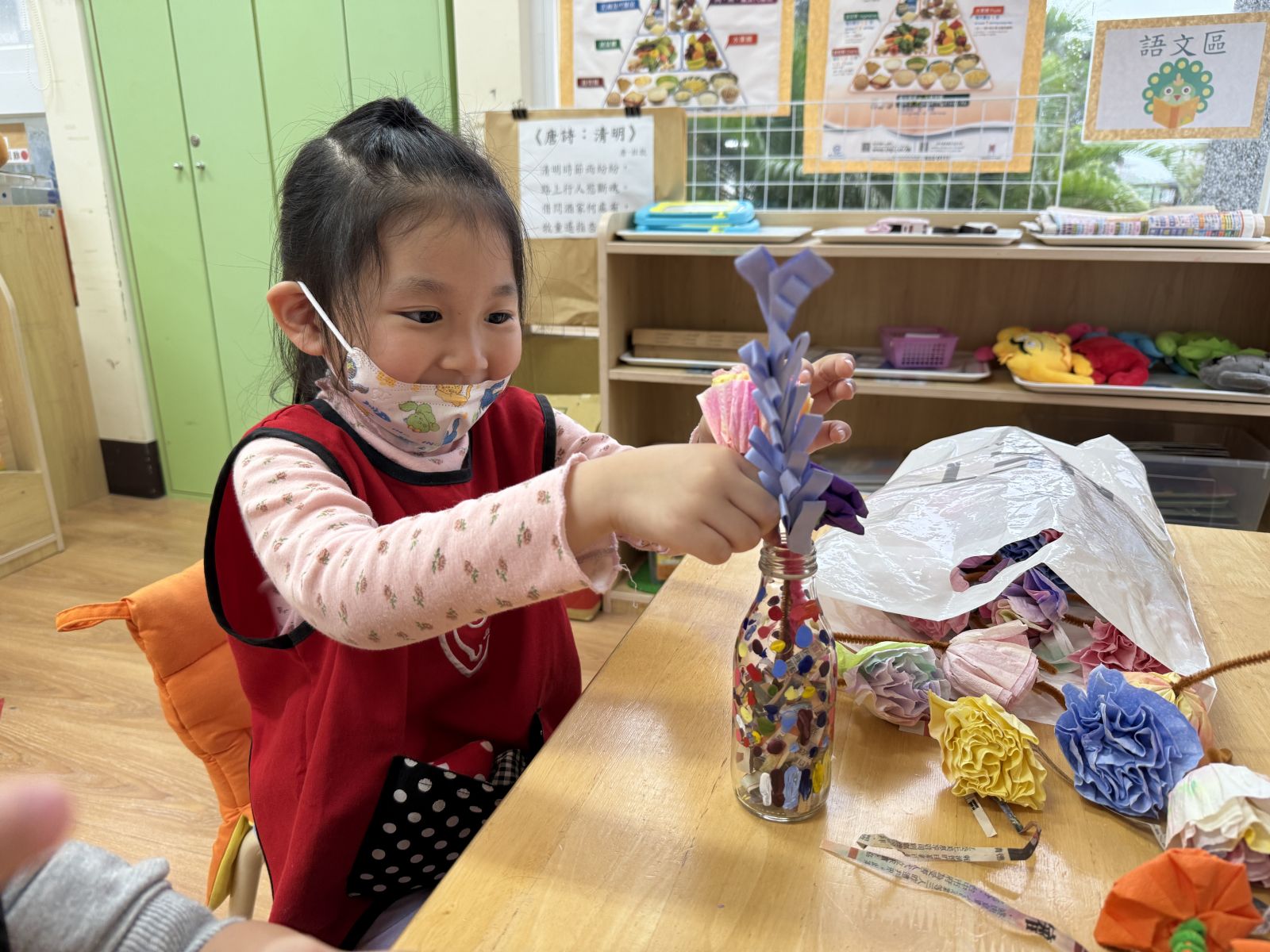 搭配主題活動:小廚師小幫手,老師提供許多美勞鬆散素材製作自己的盤中菜,運用毛根纏繞方式變成麵線、魔法玉米粒及鈕釦等當作食物的配料,讓孩子創作自己的菜餚,其次在餐桌小偵探中,讓孩子嘗試玻璃彩繪,並透過老師所提供的不同種類的花束,體驗進行插花遊戲。