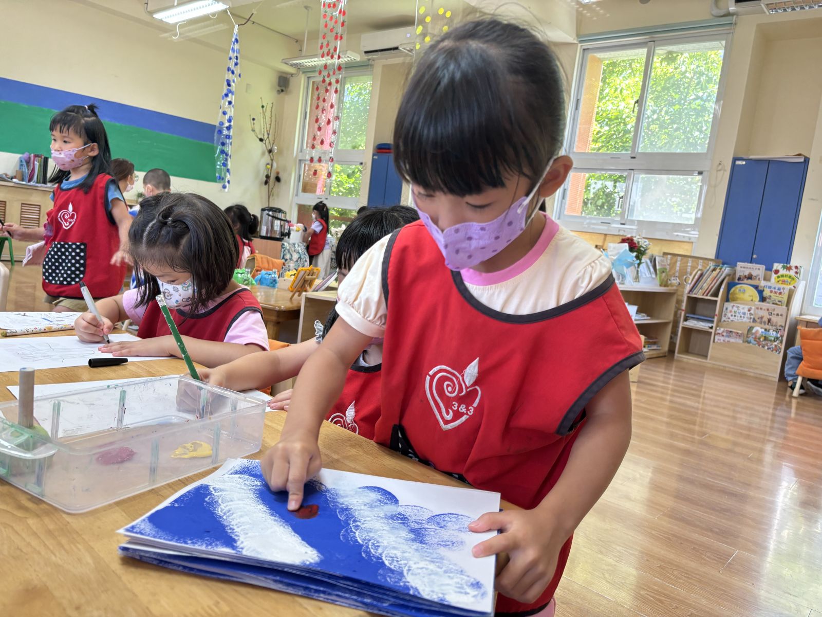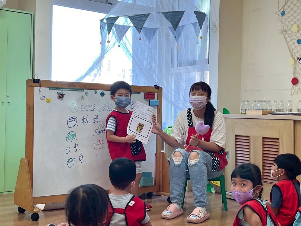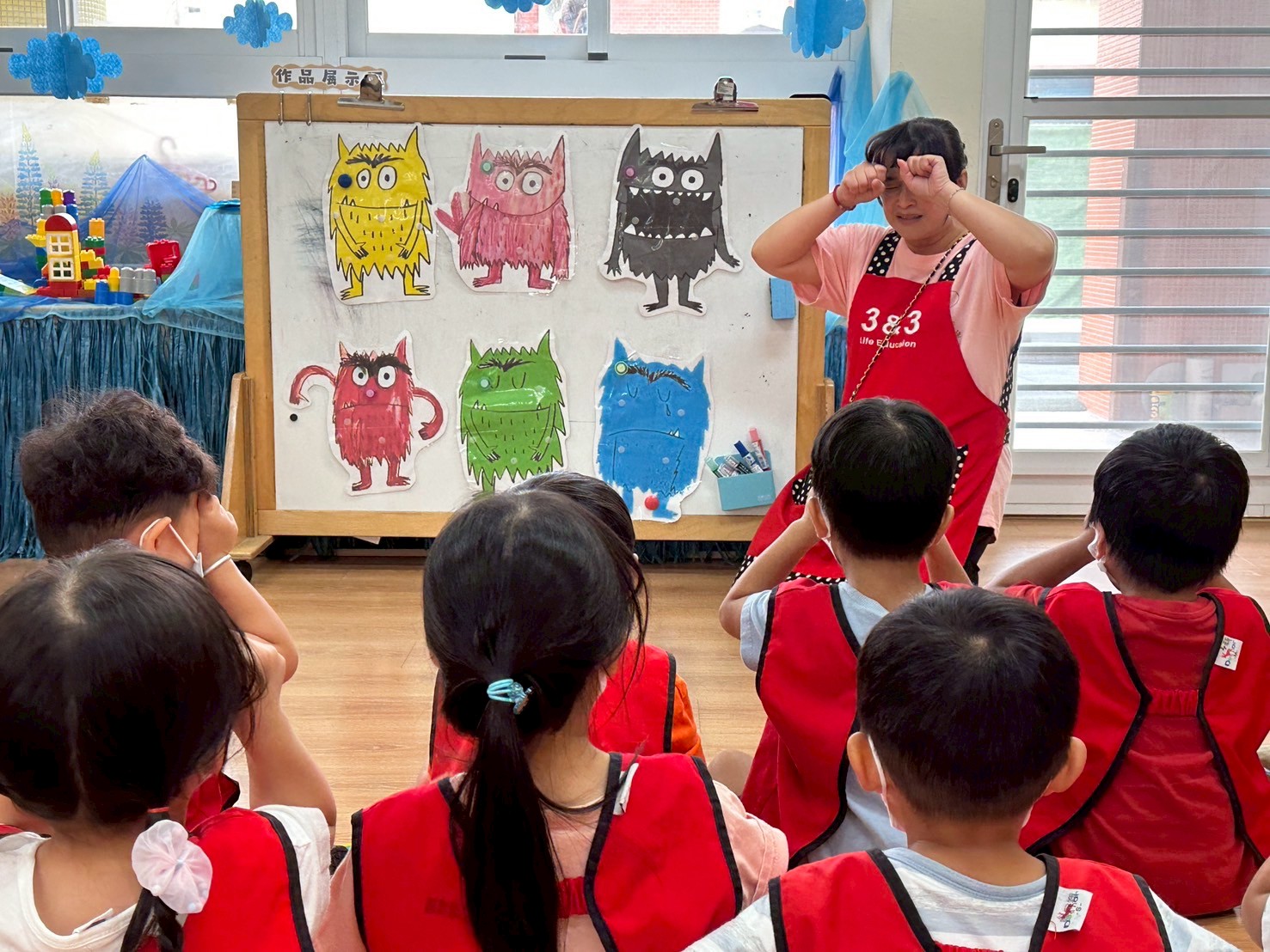 語文區裡,孩子們透過彩色怪獸的繪本和圖片,能慢慢認識角色與不同的情緒表情,學習用簡單的詞語來表達心情。他們會運用手偶和小劇場進行角色扮演,在模仿怪獸說話的過程中,嘗試用簡單的句子表達角色的語氣與感受。孩子們也能專心聆聽老師和同伴的對話,並試著回應,從中練習傾聽與表達。同時,他們會在故事延伸的活動中分享自己的感受,把語文學習和情緒覺察自然結合在一起。