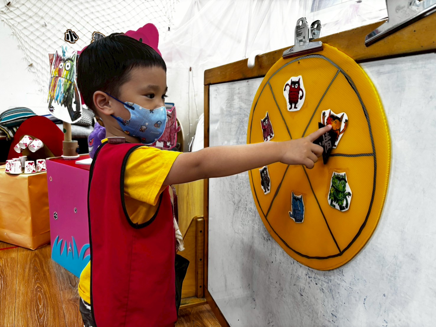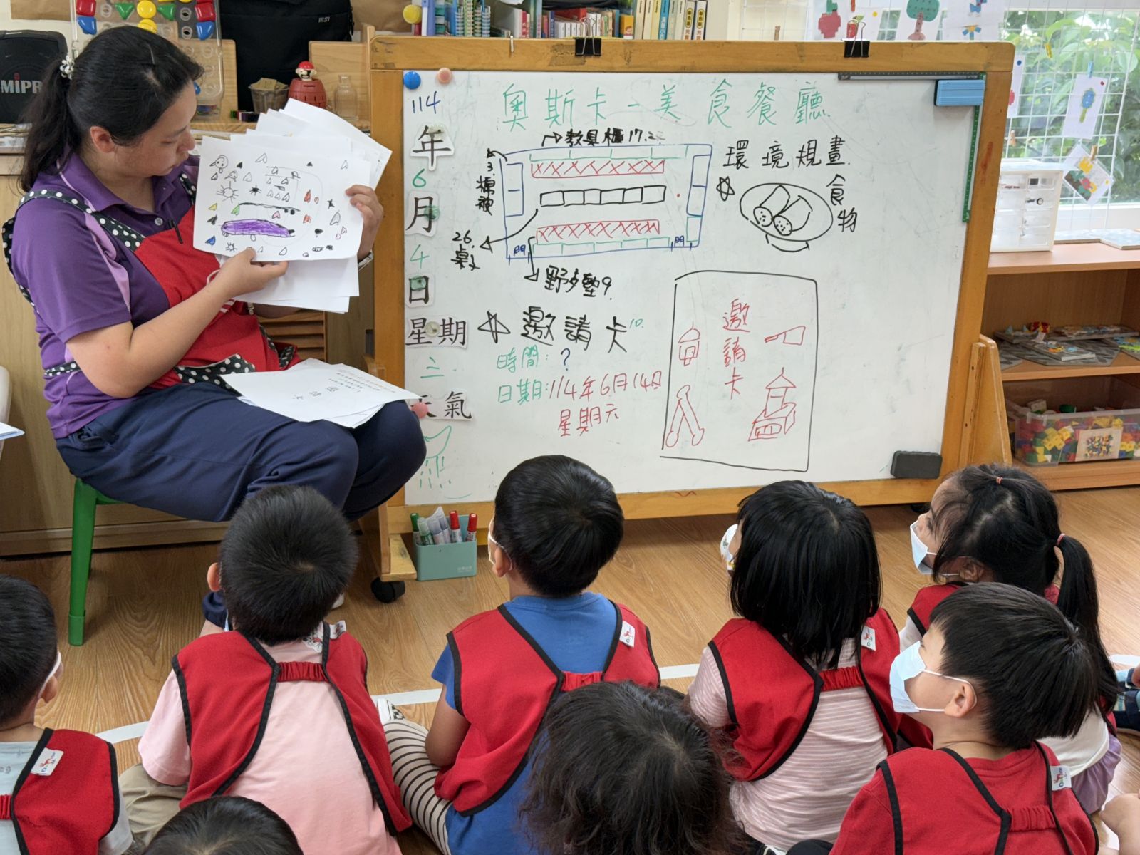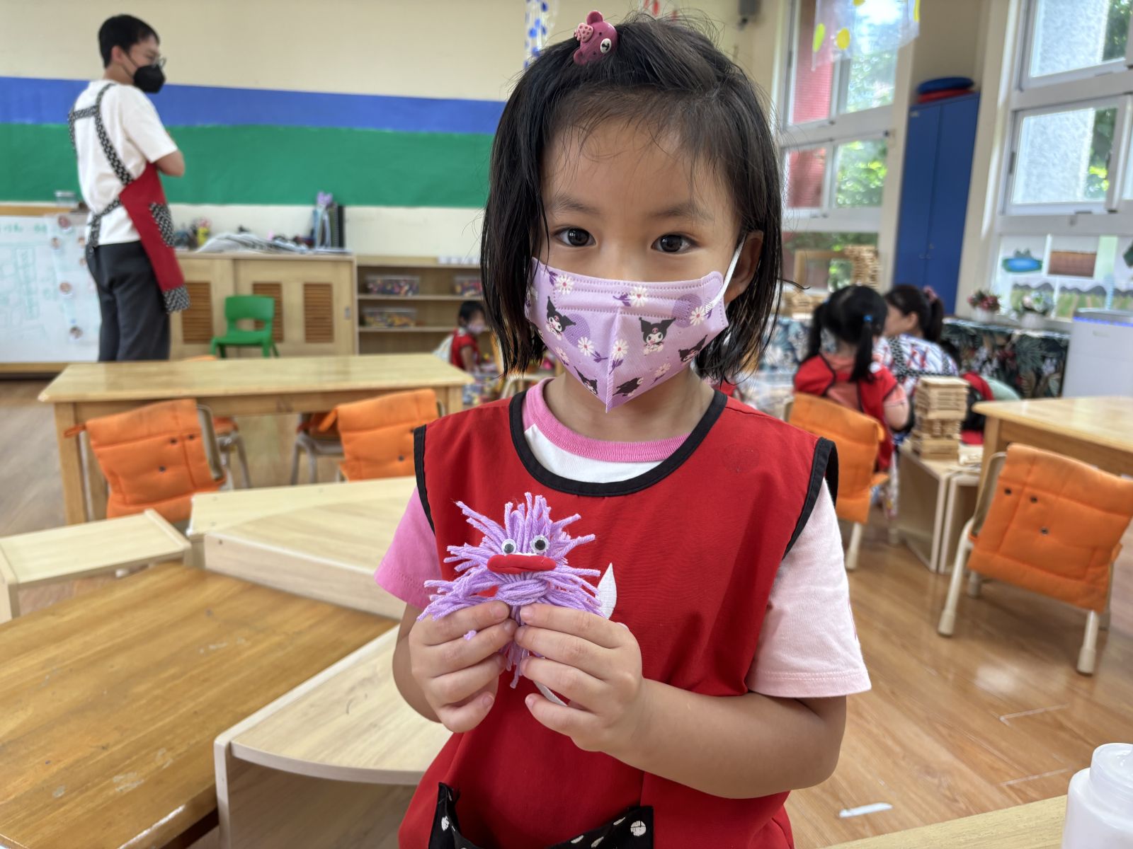 語文區裡,孩子們透過彩色怪獸的繪本和圖片,能慢慢認識角色與不同的情緒表情,學習用簡單的詞語來表達心情。他們會運用手偶和小劇場進行角色扮演,在模仿怪獸說話的過程中,嘗試用簡單的句子表達角色的語氣與感受。孩子們也能專心聆聽老師和同伴的對話,並試著回應,從中練習傾聽與表達。同時,他們會在故事延伸的活動中分享自己的感受,把語文學習和情緒覺察自然結合在一起。