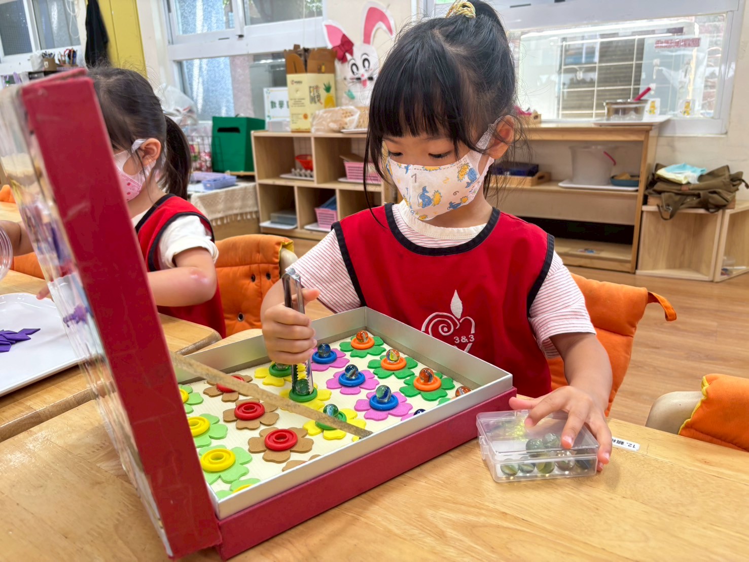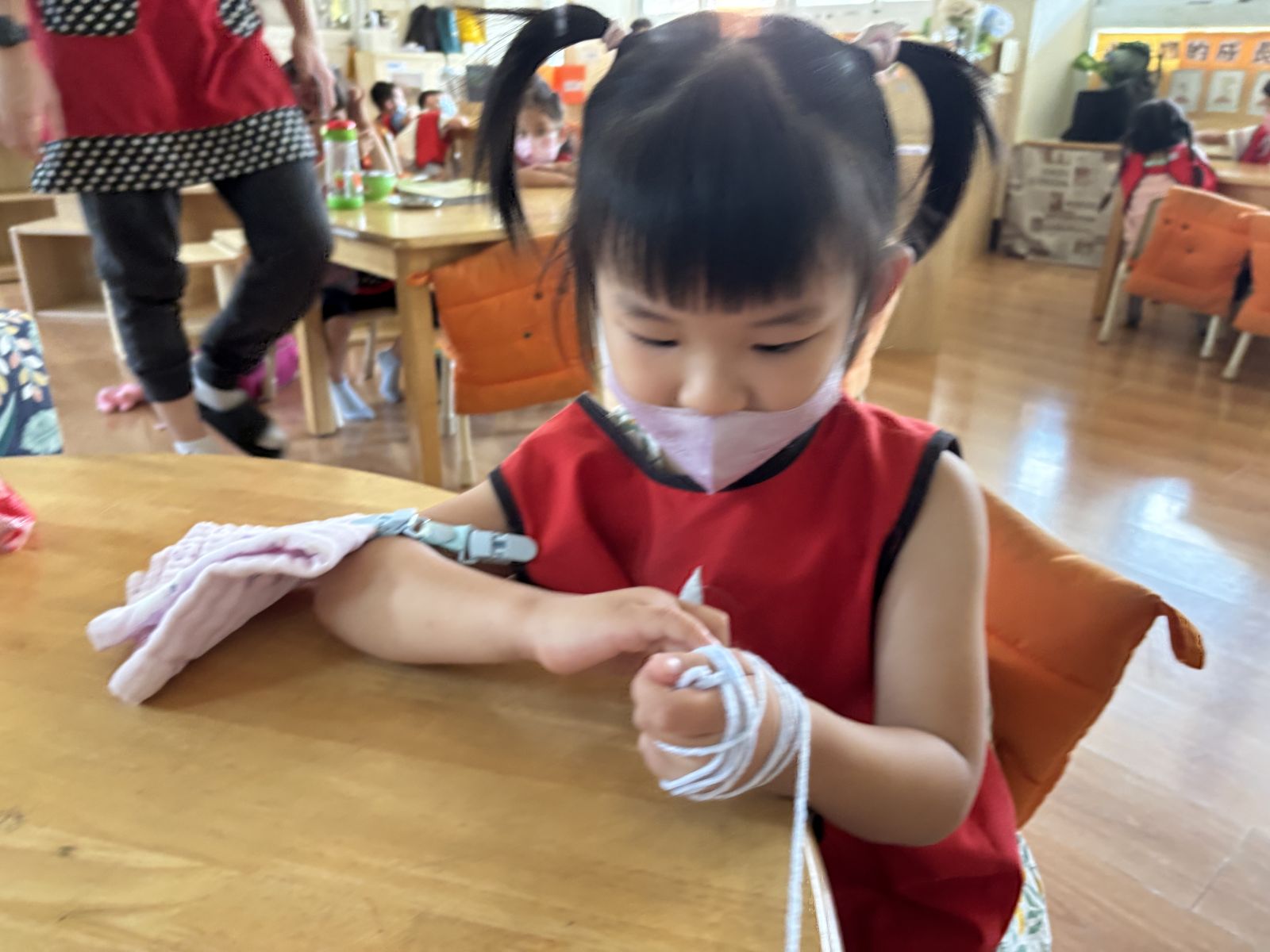透過夾取、穿洞、舀取等多樣教具,孩子們持續強化手部肌肉的穩定性與靈活度。此外,也加入曬衣情境,讓孩子練習將衣物掛上衣架並曬起來,培養生活自理能力。