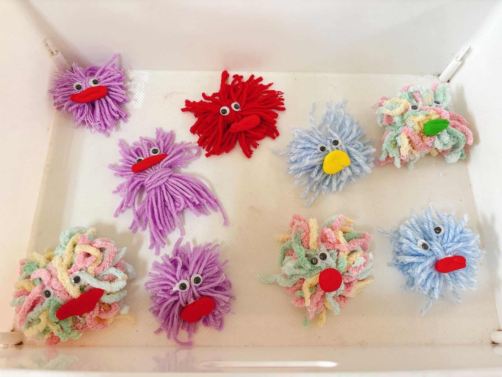在語文區中,幼兒透過彩色怪獸主題相關的繪本、手偶與冷靜瓶操作,逐步練習語言表達與情緒理解。幼兒能在手偶遊戲中模仿角色語氣與對話,嘗試以語言描述顏色所代表的心情;同時在繪本閱讀與討論過程中,增進詞彙量與理解力,並學習傾聽同儕的分享。藉由冷靜瓶的操作,幼兒可體驗自我情緒調節的方式,進一步將語文學習與生活經驗連結,培養溝通、表達與社交互動的能力。