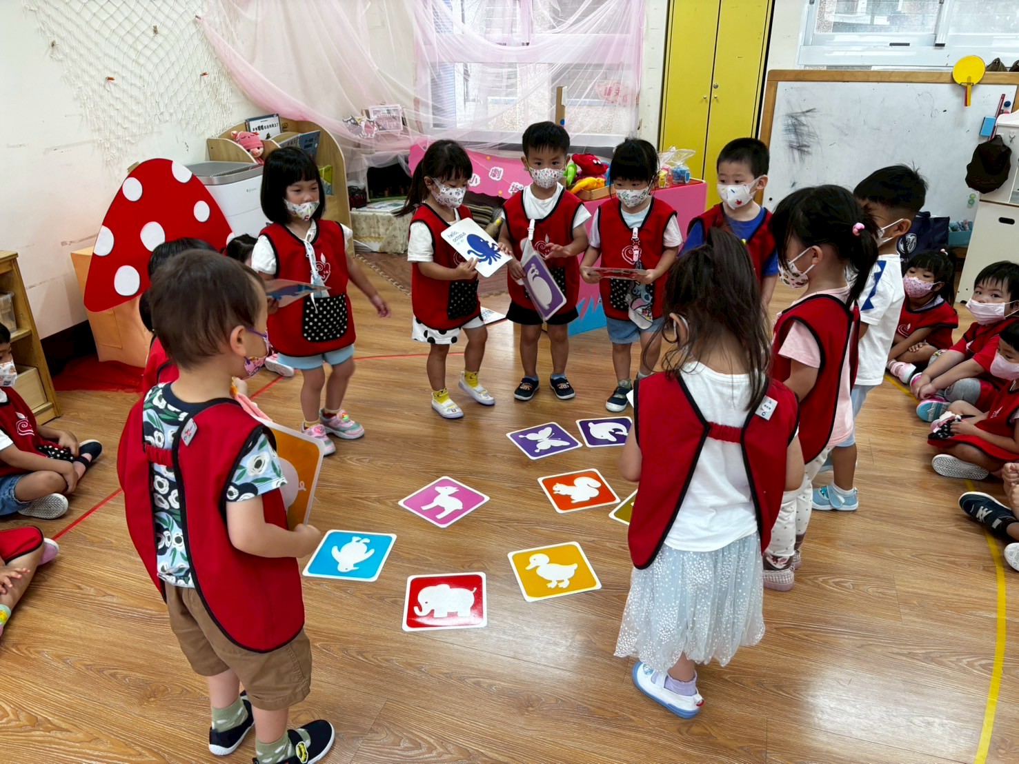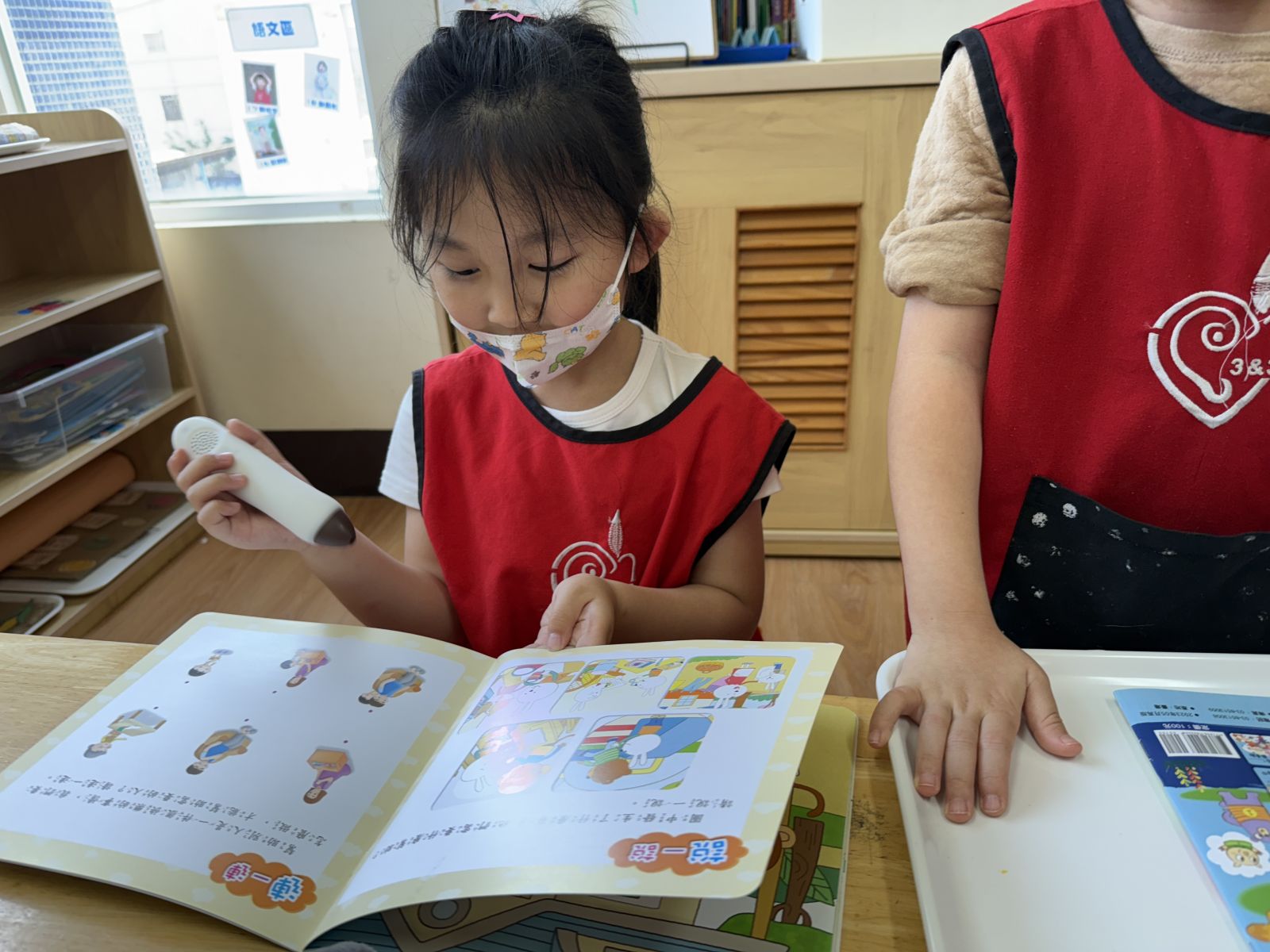 孩子們透過點讀筆聆聽《我的快樂歌謠》和班級歌,感受語詞韻律並熟悉歌曲。同時進行姓名配對遊戲,練習辨識名字,認識自己與同伴,提升文字敏感度。
