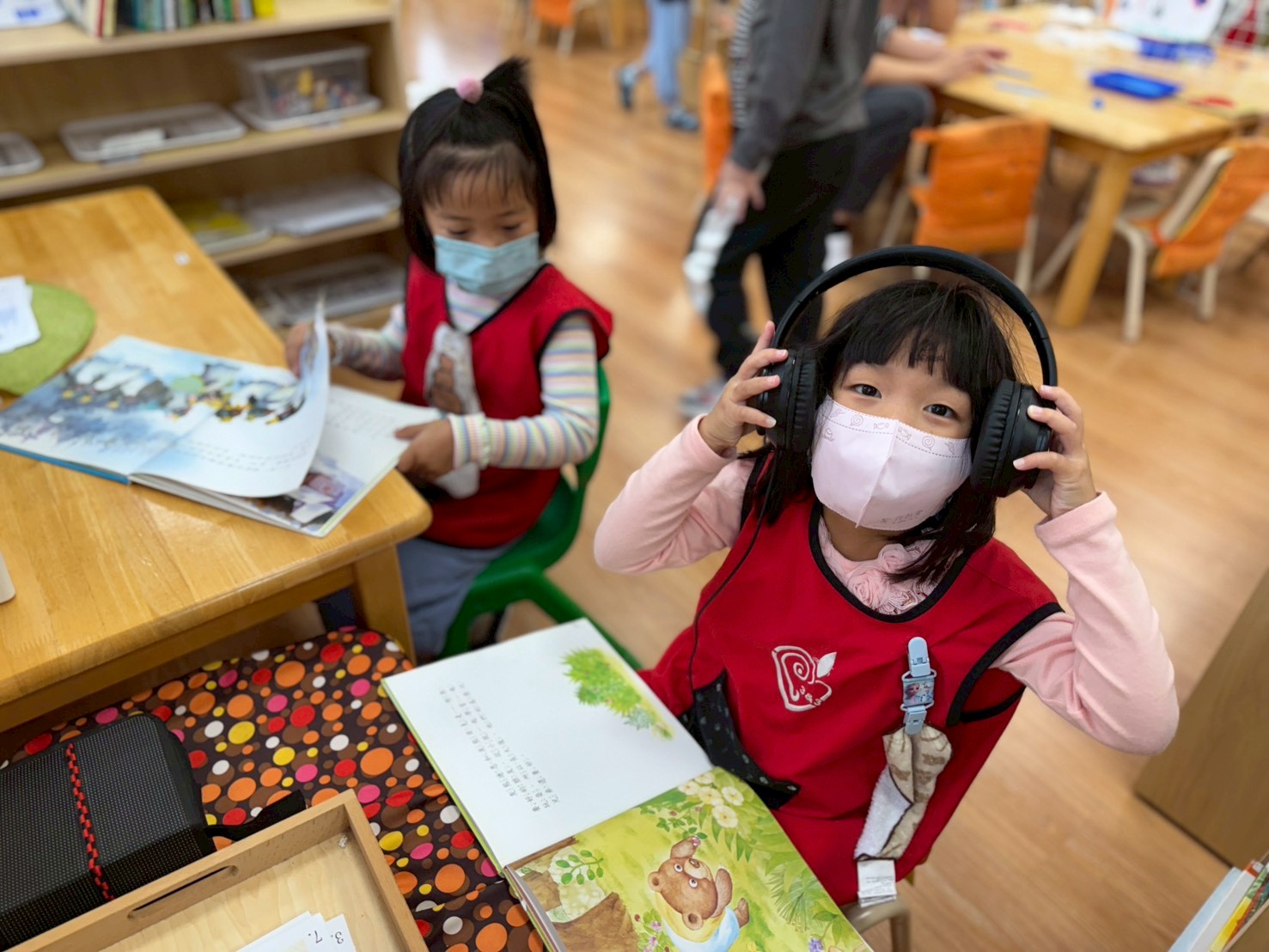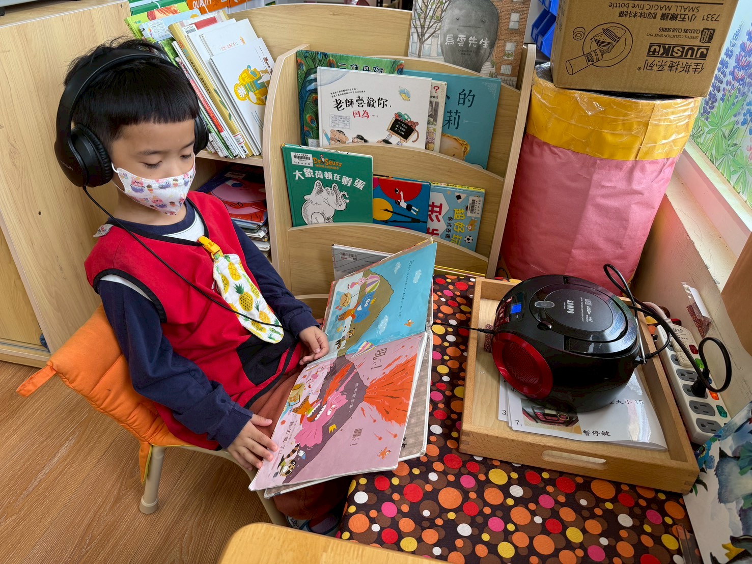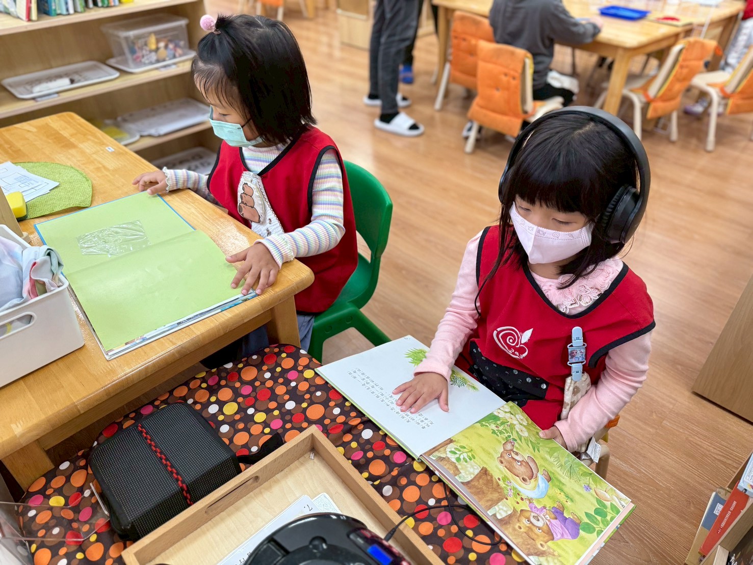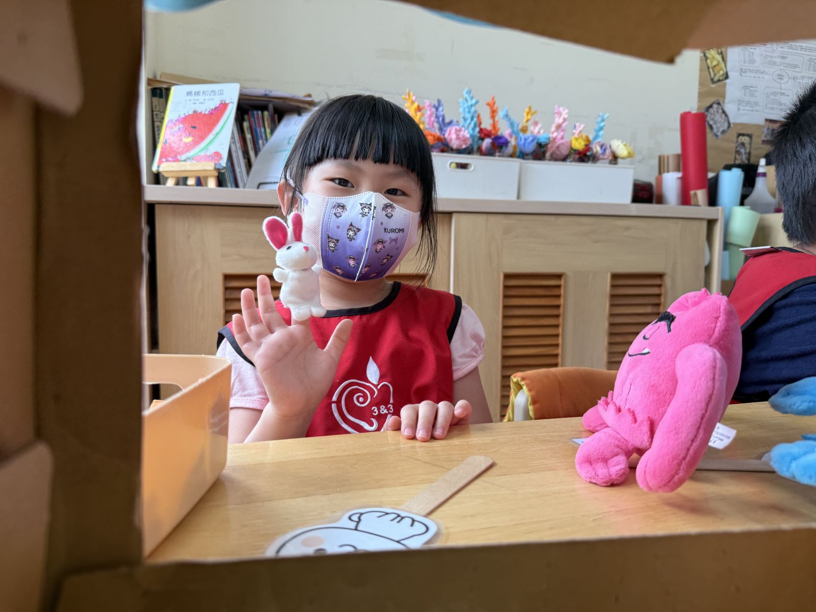 語文區老師增加了點讀筆故事繪本,邀請孩子們共同錄製製作說故事內容,讓孩子體驗說故事,聽聽他人說故事內容,在過程中練習用清晰口語方式說故事,也透過教具中的情緒怪獸及手偶扮演,與他人建立社會人際互動扮演正確溝通能力。