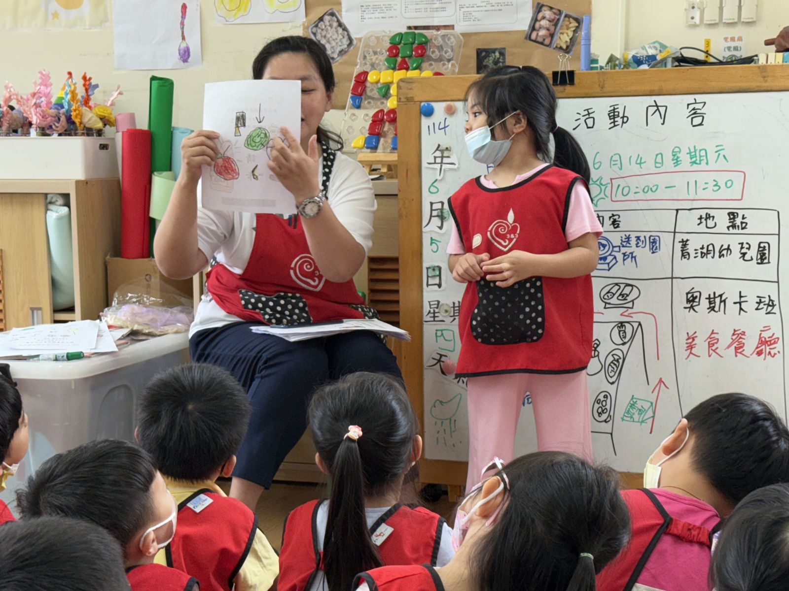 這學期我們做了哪些有關主題作品呢?(麵食創意料理、花瓶創意畫、廚師帽創意DIY等)讓我們回顧這些美勞作品製作方式,透過高峰活動環境規劃圖表上,討論這些作品要擺放教室在哪裡作為展示。