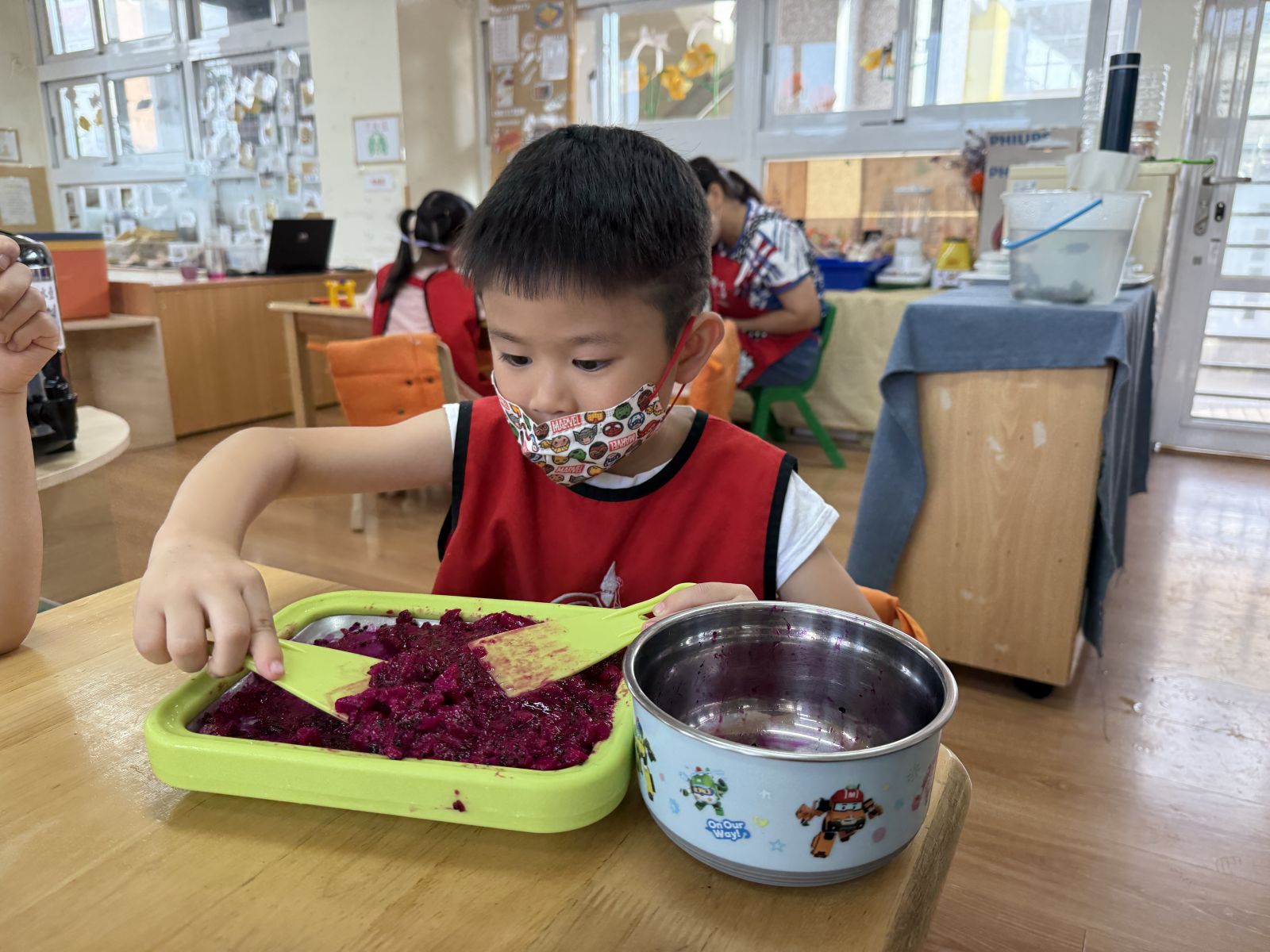 老師增設炒冰機並示範操作流程,將水果切成塊狀直到泥狀、等到結冰,再將炒冰上的水果冰放在餐碗上使用,讓孩子們體驗運用水果在炒冰機上樂趣。