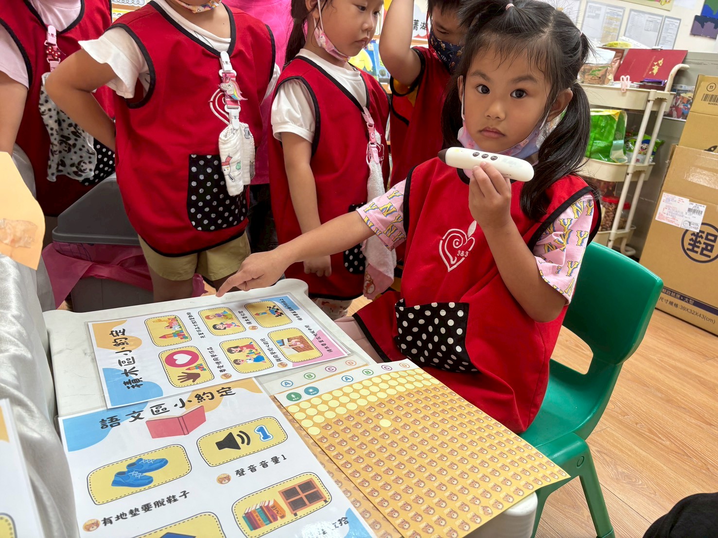 在認識並了解學習區規則後,透過遊戲活動如拼圖和「魔法師變變變」,來複習課程內容。接著,運用點讀筆進行錄音,最後將孩子們討論出的學習規則整理並張貼於學習區中。