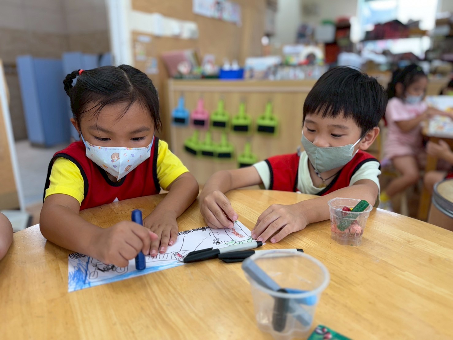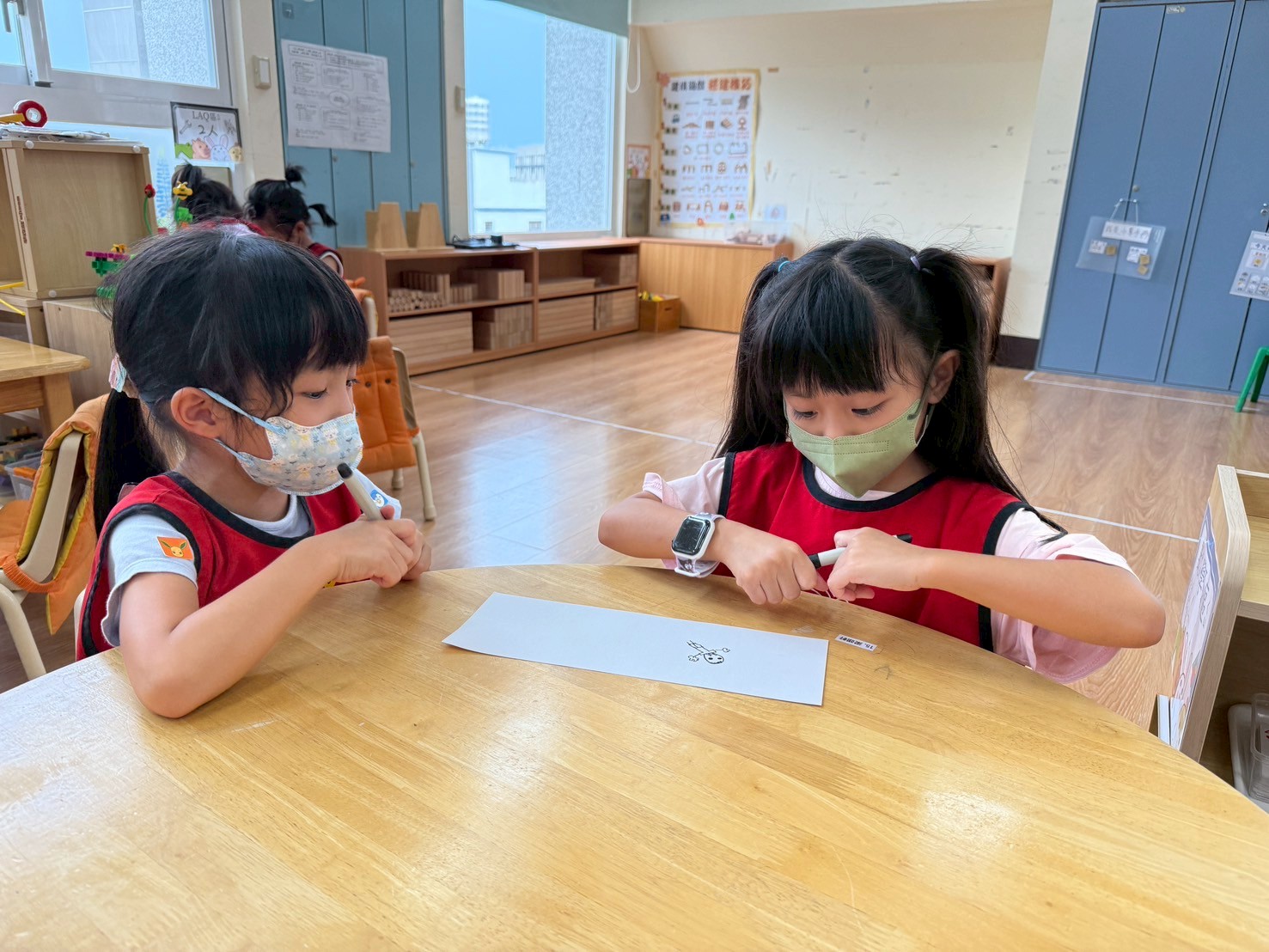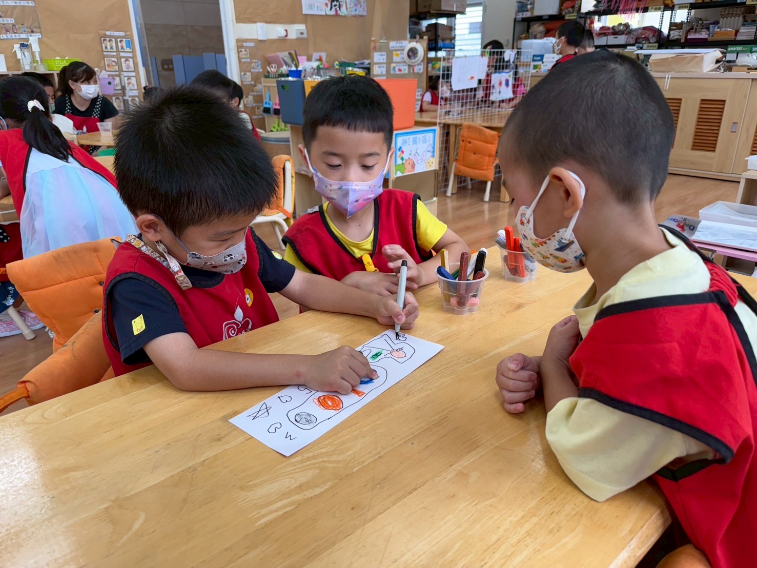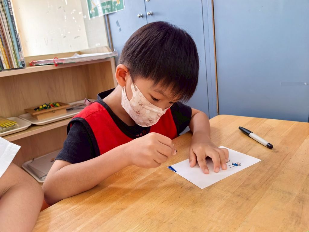 孩子們觀看小人物圖示後,依步驟塗畫頭、身體與四肢,並主動加入五官與服裝細節。過程中展現觀察力、手部操作能力,並發揮創意表現自我。