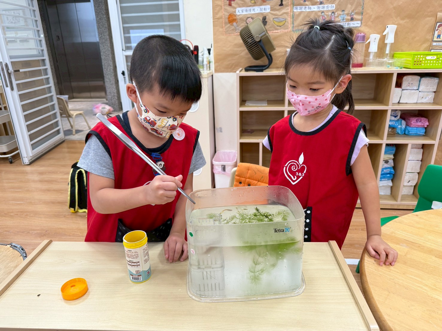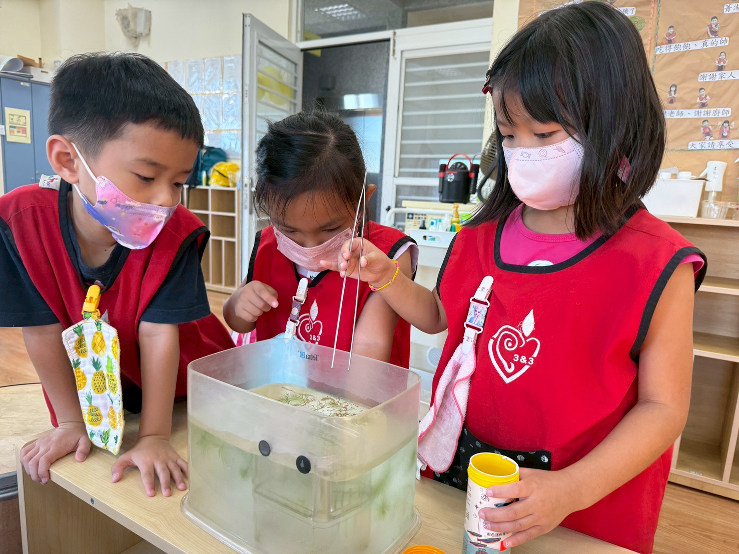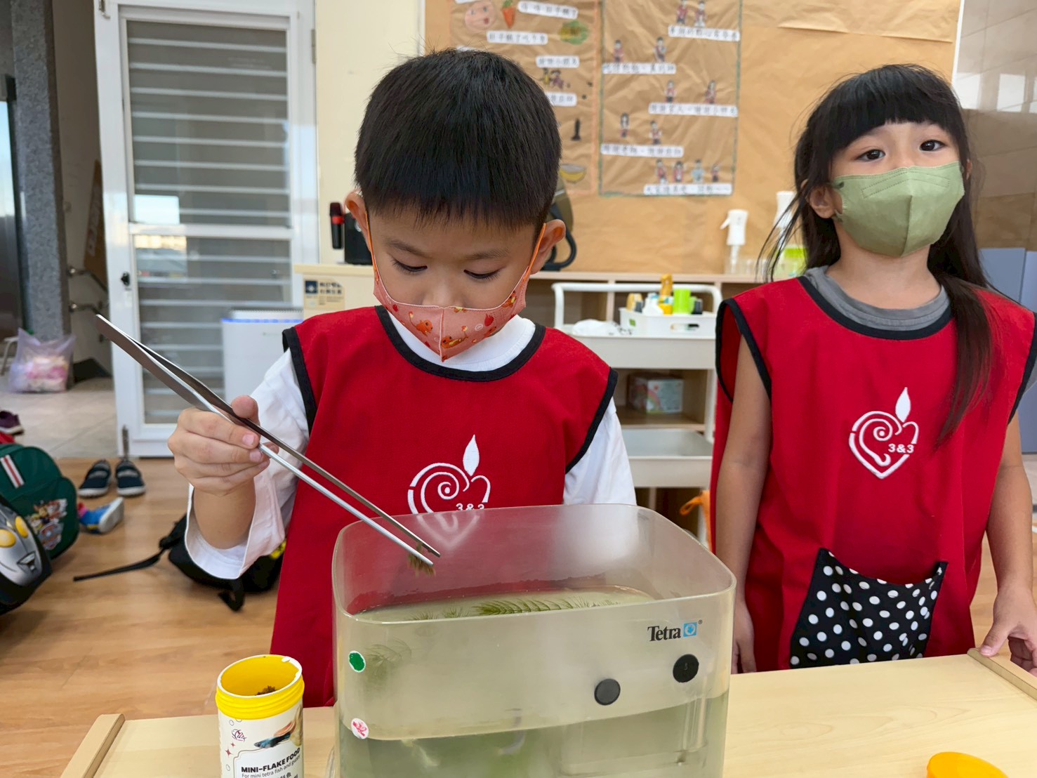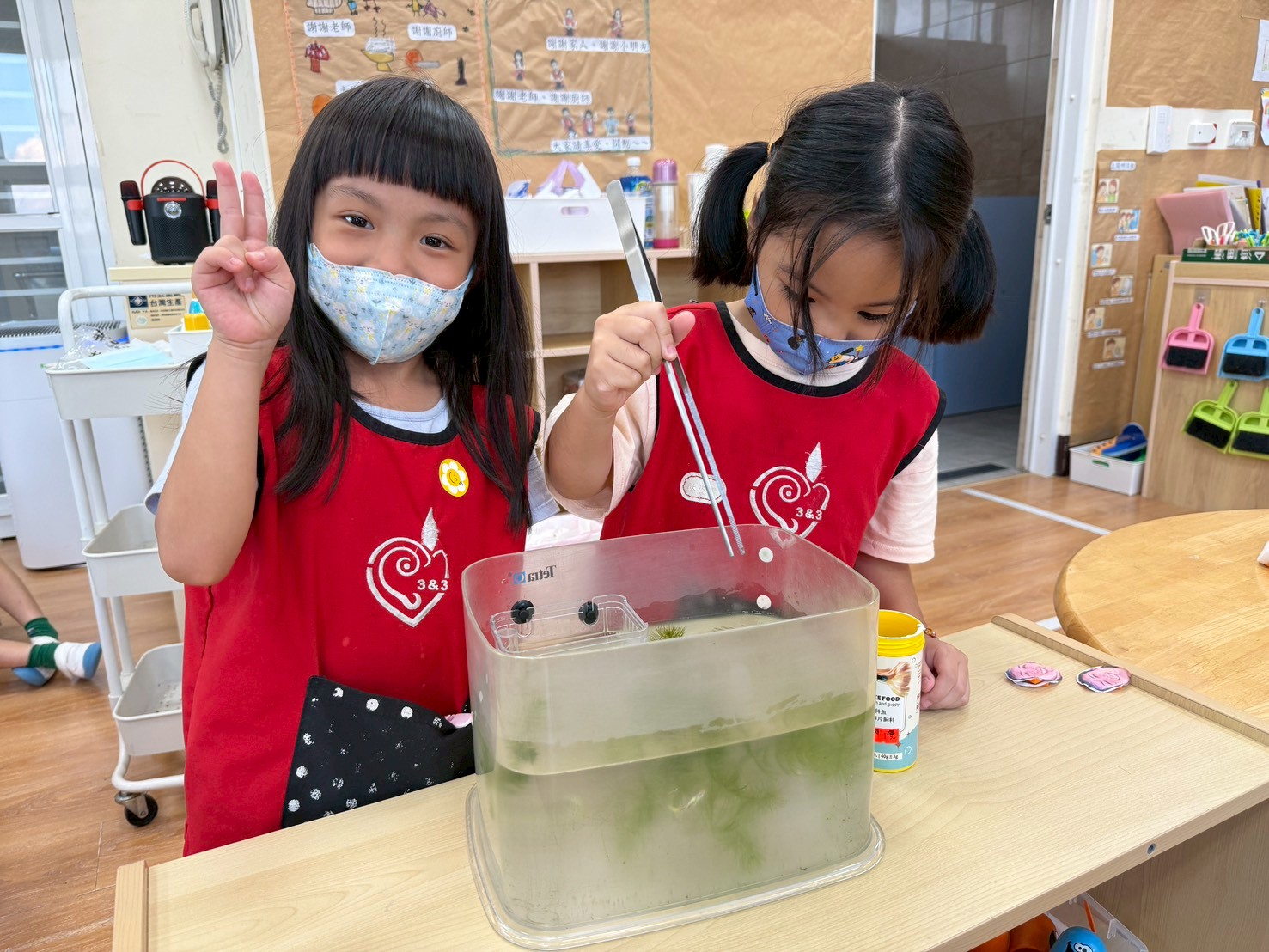 孩子們在戶外餵魚,體驗生命成長的珍貴。他們細心觀察魚的變化,並分享發現。這樣的互動不僅提升了觀察力,也增強了他們對生命的關懷與責任感。