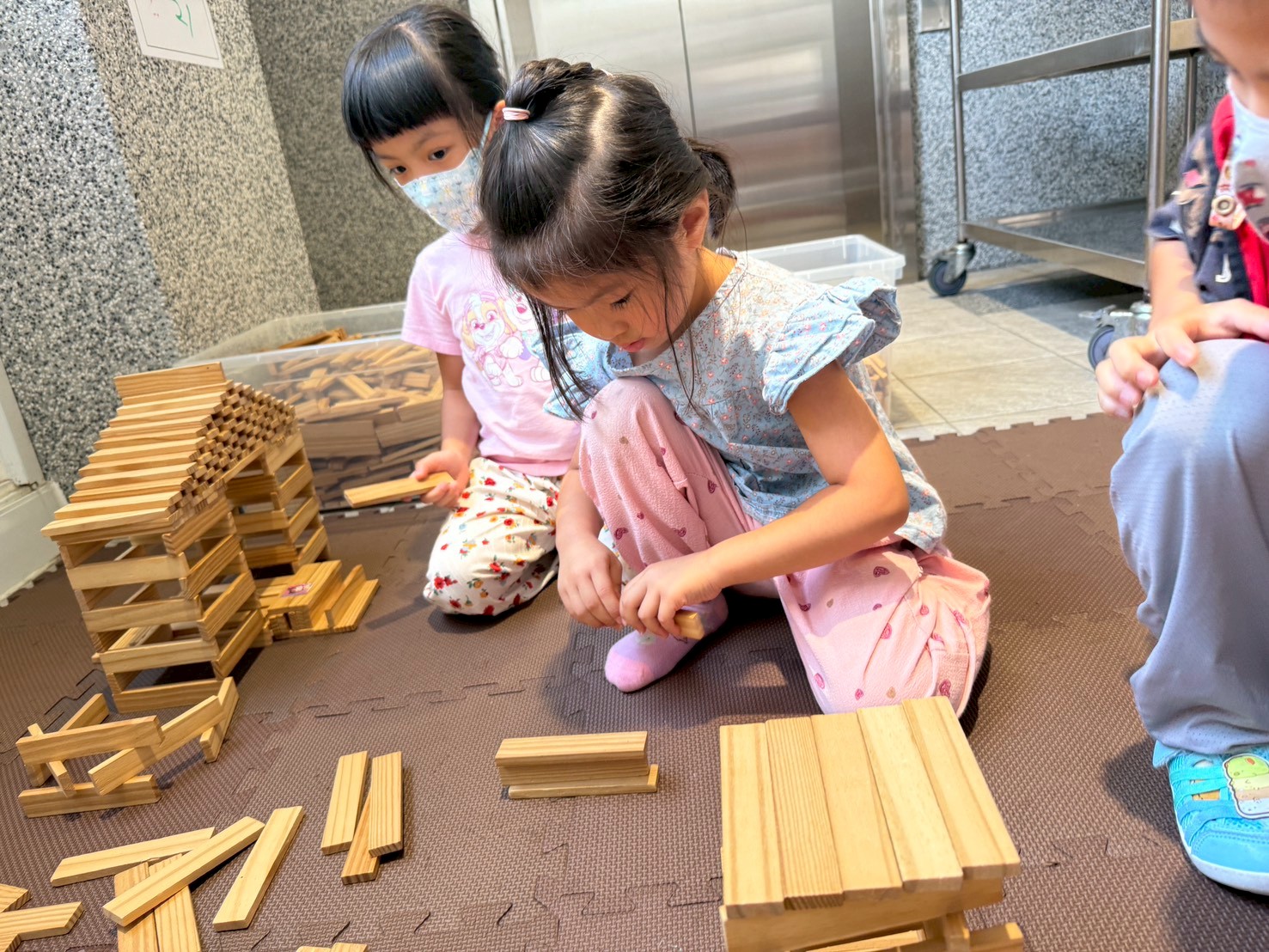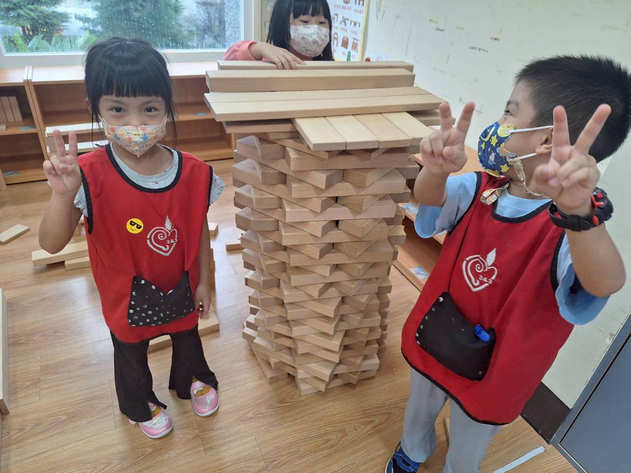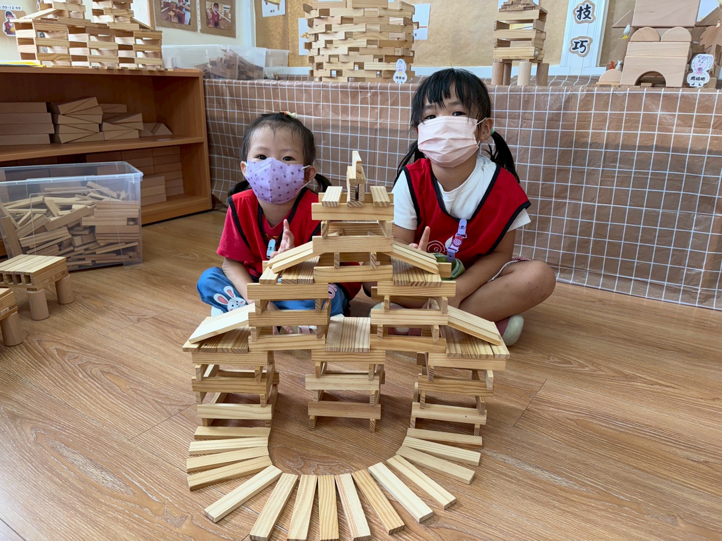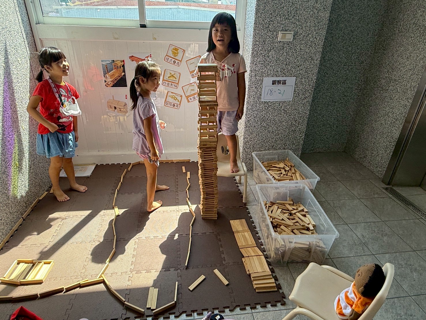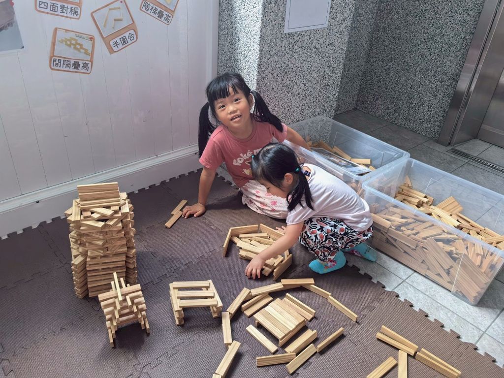 積木區孩子們透過討論與合作,一步步蓋出兩座風格不同的高塔。從基座設計到逐層堆疊,他們觀察平衡與結構,一座追求高度層次,一座展現穩固對稱的美感。