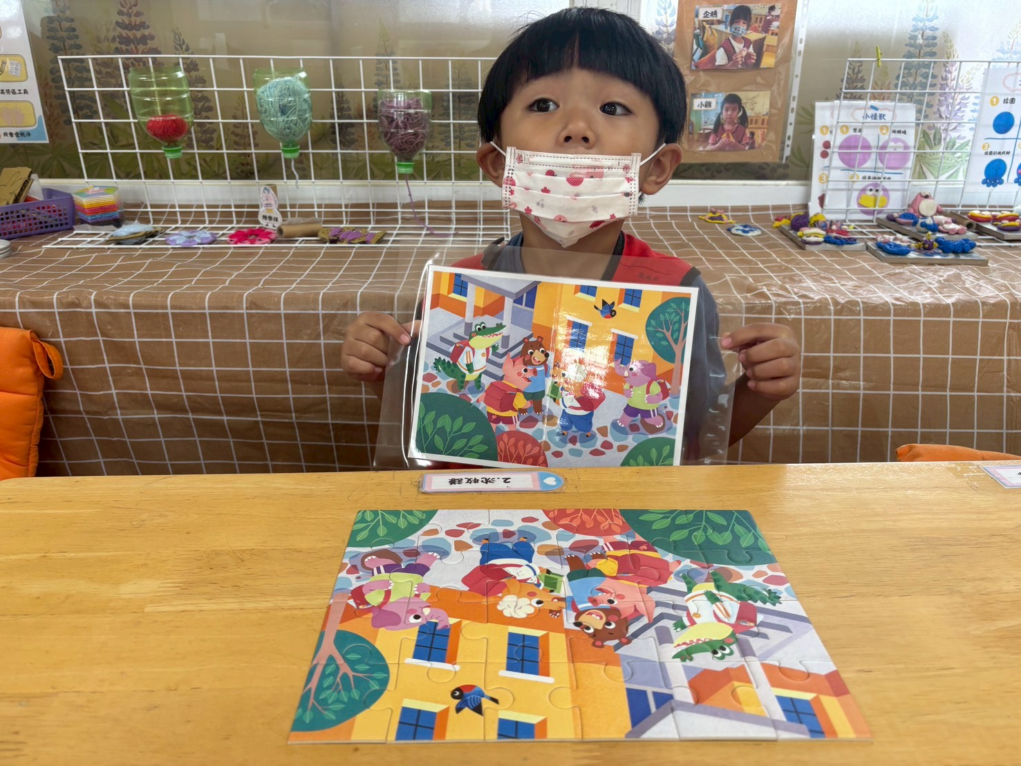 孩子在數學區進行拼圖活動時,先從從星星數較少的拼圖開始挑戰,逐漸過渡到星星數越高的拼圖,過程中透過觀察形狀、顏色與位置進行思考與調整,展現耐心、專注力與邏輯思考能力。