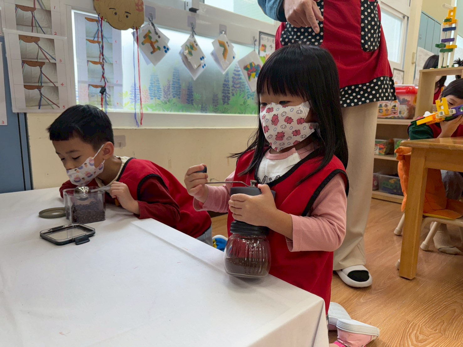 本週增加磨咖啡機的活動,透過全指運動須配合身體力量去旋轉開關,透過指引箭頭將咖啡豆磨成粉,孩子們看到自己的努力有所成果,自信滿滿唷!