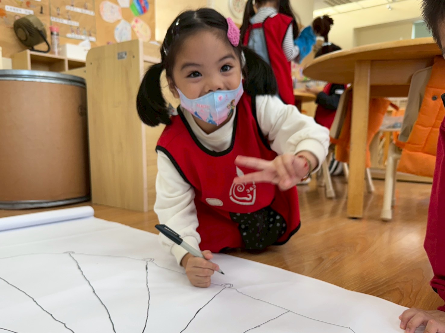 友誼大畫布班級孩子們運用簽字筆所畫出的線條,及粉蠟筆混色來創作,發揮想像並享受自我表現的樂趣。期待作品完成後再討論友情大布畫名稱(友情氣球傘)。